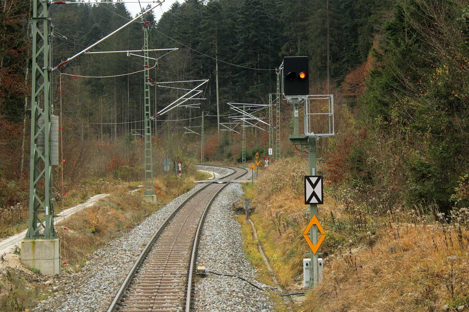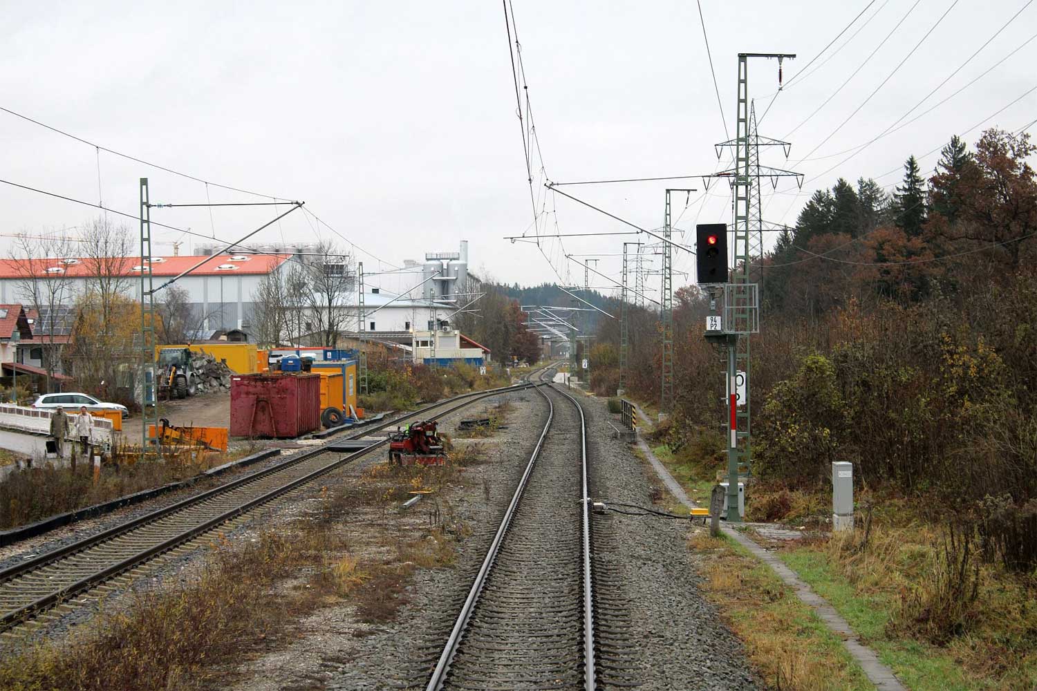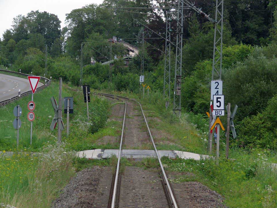 | km 65,58 der Strecke Mühldorf (Oberbay) 0,0 - Tüßling 7,02 - Garching 16,41 - Freilassing 65,58 mit abgehender Strecke [Mühldorf (Oberbay) 0,0] - Tüßling 7,02 - Burghausen (Oberbay) 32,23 - (Wackerwerk 33,53) | ||