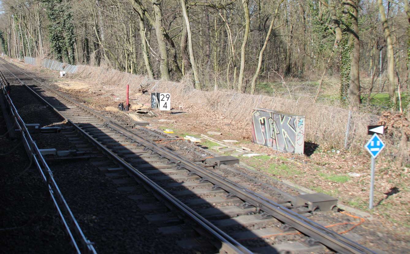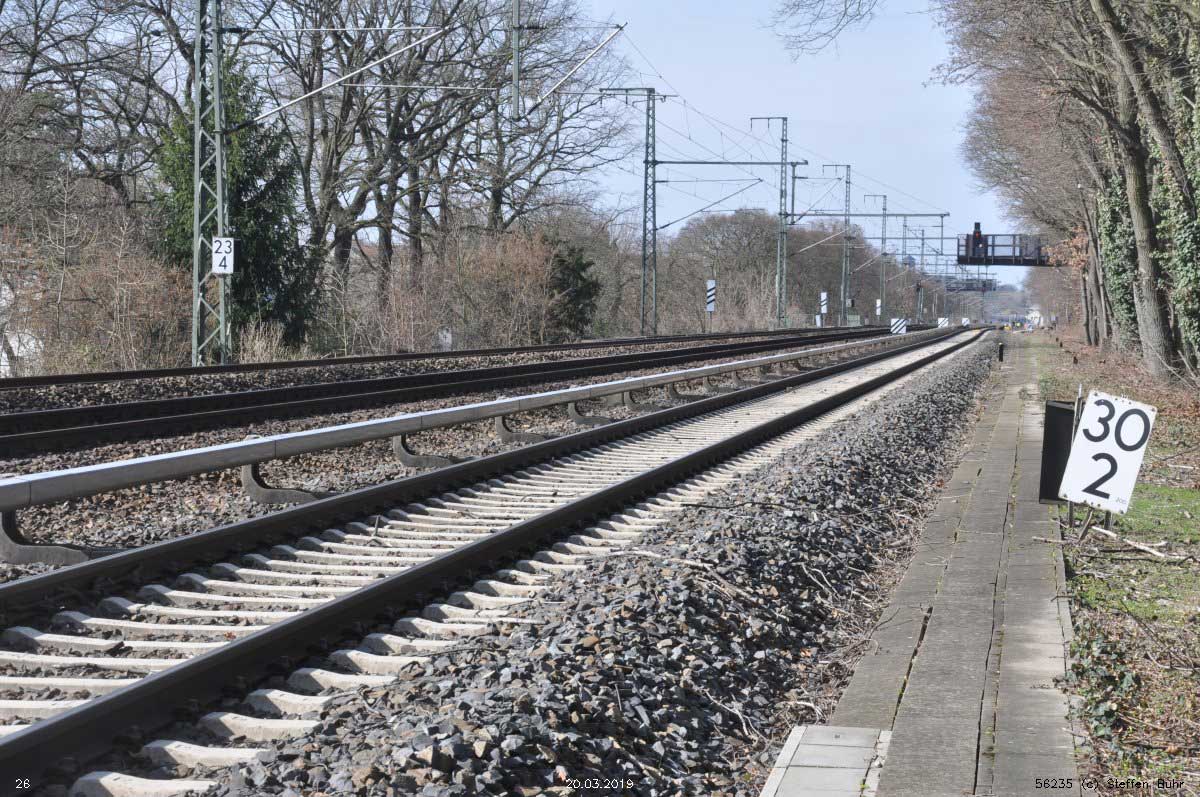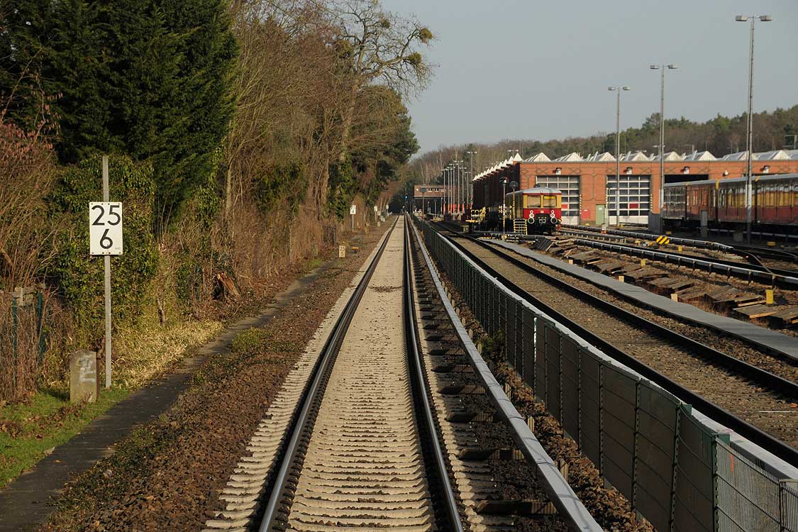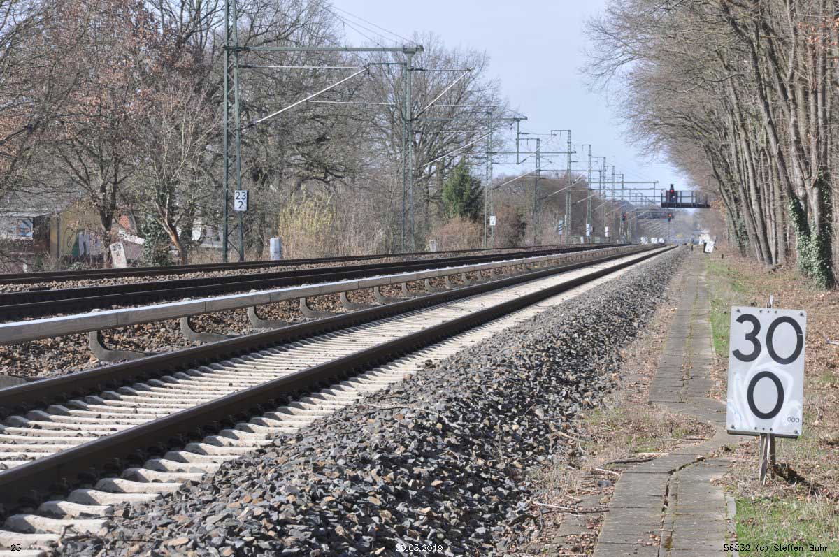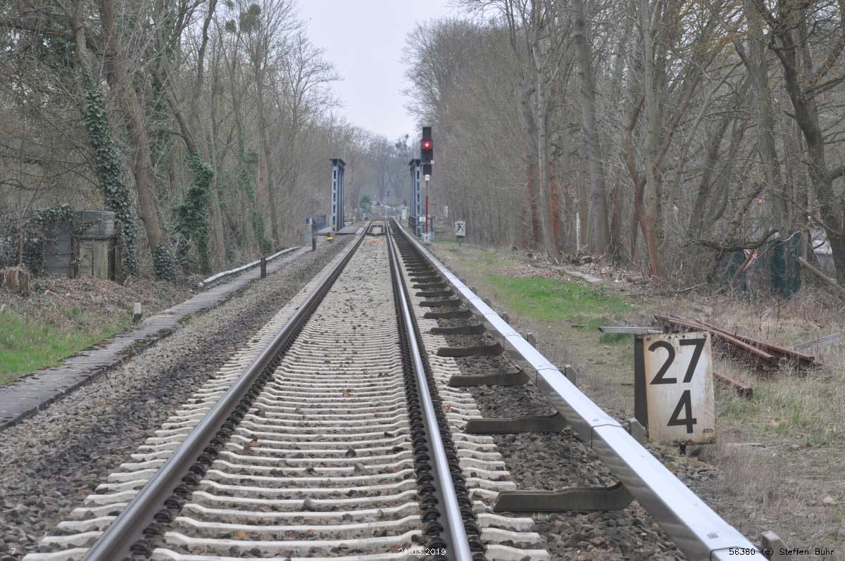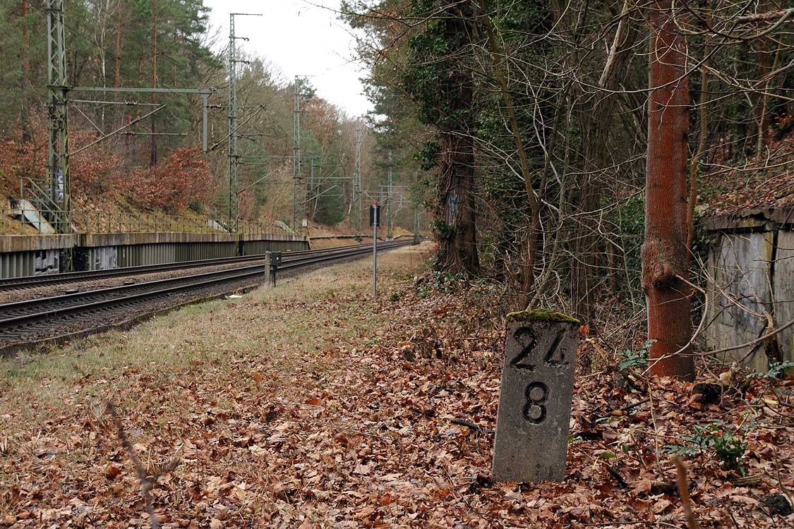 Vor dem Stellwerk Pdo ist noch der Stein km 25,3 zu erkennen.