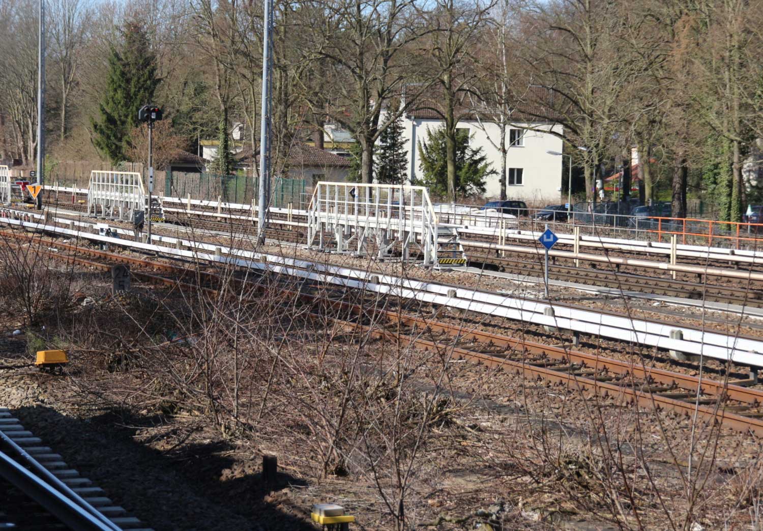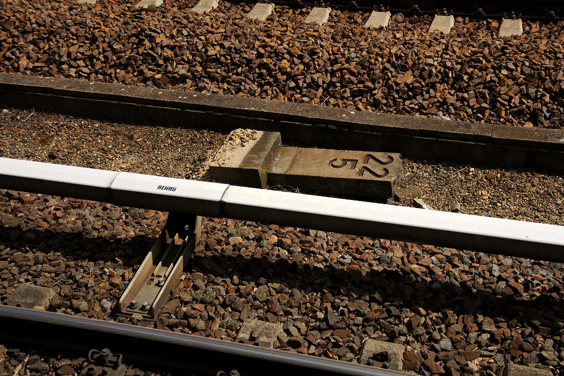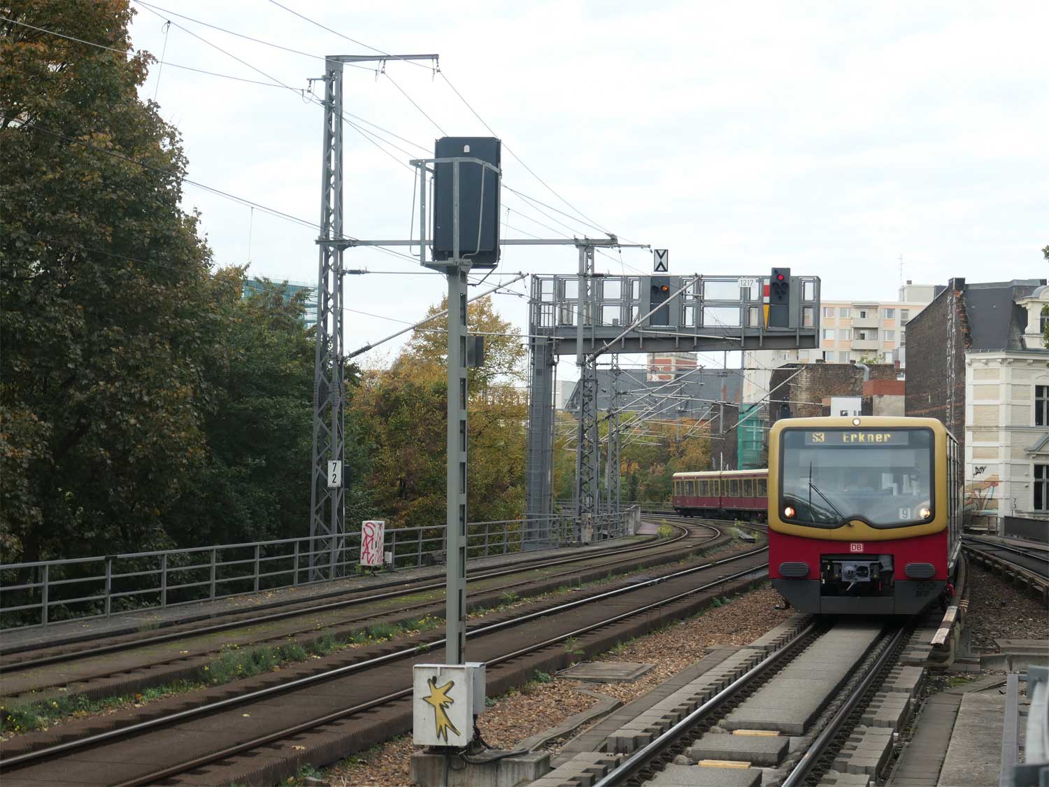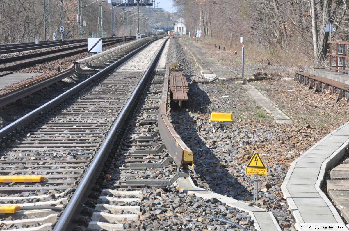Brückenleitschienen an der EÜ Paul-Neumann-Straße. Die Brückenleitschienen verhindern, daß die Stromabnehmer an den Brückenträgern abgerissen werden. Dazu werden die Stromabnehmer von der Brückenleitschiene in Richtung Gleisachse gedrückt. Die Brücken dürften daher aus der Zeit vor der Elektrifizierung 1928 sein. Es gibt aber auch neuere Brücken mit Leitschienen. Die gelben Einrichtungen im Gleis sind Balisen des neuen, ETCS-basierten Zugbeeinflussungssystems der Berliner S-Bahn (ZBS), das die alten, mechanischen Fahrsperren ersetzt.
