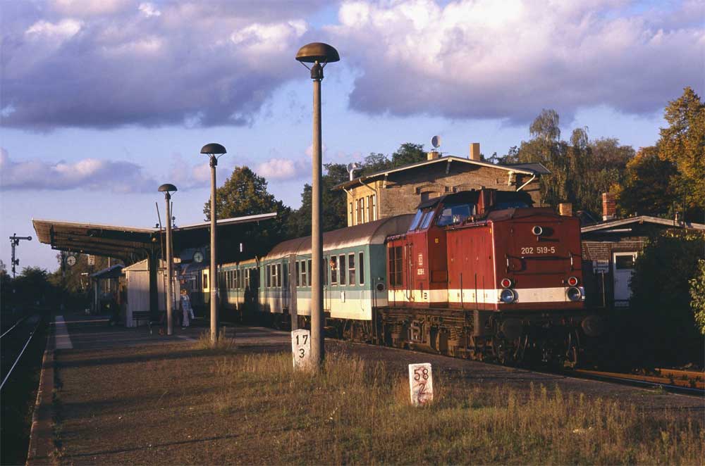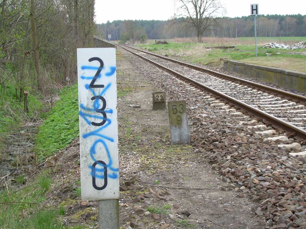 | Zühlsdorf | 20,3 | km 61,2 der Strecke Teltow 0,0 - Lichtenrade (GAR) 7,7 - Schönefeld (GAR) 15,3 - Eichgestell 26,2 - Springpfuhl 35,0 - Karow 45,5 - Basdorf 58,3 - Wensickendorf 63,9 - Fichtengrund 73 |