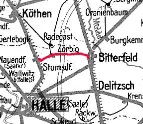 | km 131,64 der Strecke Berlin Anhalter Bf -0,07 - Jüterbog 62,82 - Bitterfeld 131,64 - Halle (Saale) Hbf 161,65 | ||