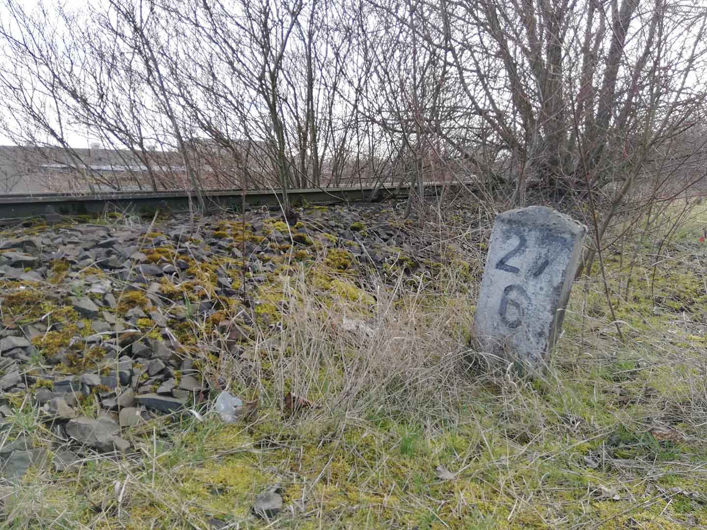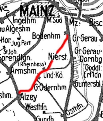 | Alzey | 30,90 | km 8,98 der Strecke Langmeil (Pfalz) 0,0 - Marnheim 14,14 - Streckenunterbrechung - Kirchheimbolanden 19,55 - ehemalige Landesgrenze Pfalz/Hessen km 25,73 = km 0,0 - Alzey 8,98 - Armsheim 16,67 - Mainz Hbf 50,07 |
