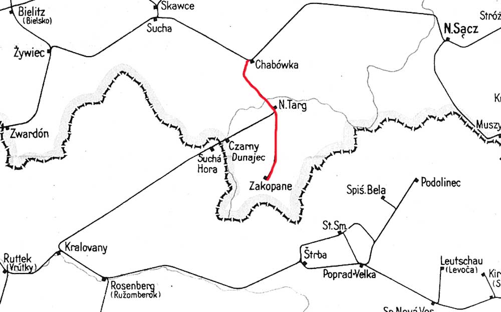 | Neumarkt (Dunajec) | 22,575 | km 0,0 der Strecke Neumarkt (Dunajec) 0,0 - Podczerwone 18,015 - Grenze Ostbahn/Slovakai - Sucha Hora 70,030 - Kraľovany 0,102 |