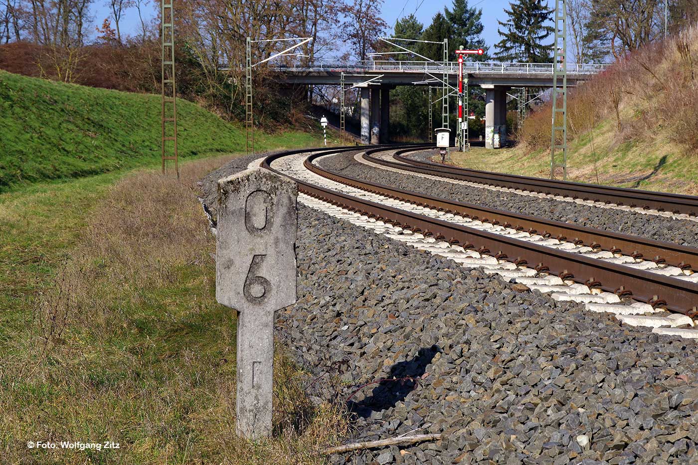 km 1,9 (Stein) und km 2,0 (Tafeln) zwischen Abzw Hanau Rauschwald und Großkrotzenburg - Blick Richtung Abzw Hanau Rauschwald