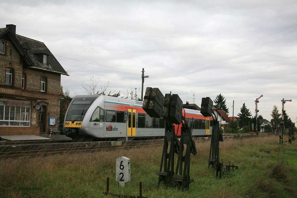 | 1968 musste die Strecke zwischen Berstadt-Wohnbach und Inheiden aufgrund des Braunkohleabbaus auf eine neue Trasse verlegt werden. Dies betraf auch den Haltepunkt Obbornhofen-Bellersheim, der am 9. Juni 1968 verlegt wurde. Die alte Trasse ist heute abgebaut, jedoch aus der Luft noch erkennbar. Die Strecke wurde dadurch 940 m kürzer. Der Kilometersprung wurde in den Bf Hungen gelegt. |
