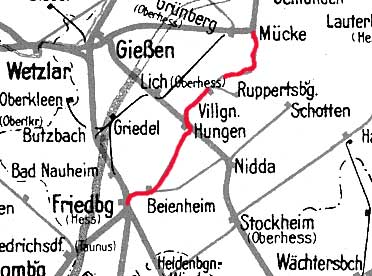 Friedberg (Hess) 0,0 - Hungen 23,43 (kommend)/24,37 (gehend) - Mücke (Hess) 49,21 (ab 1968)
