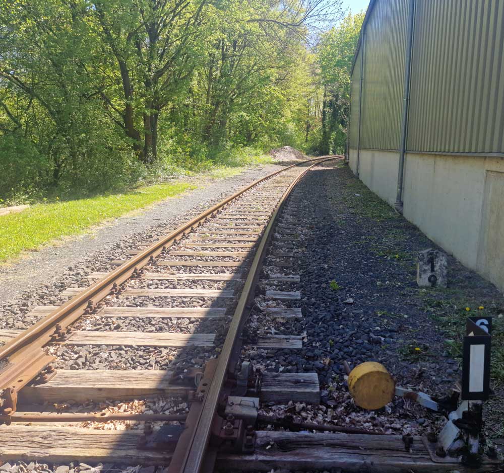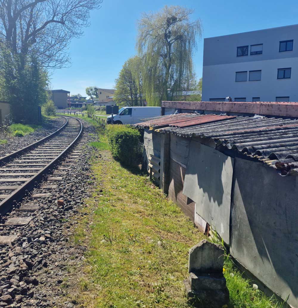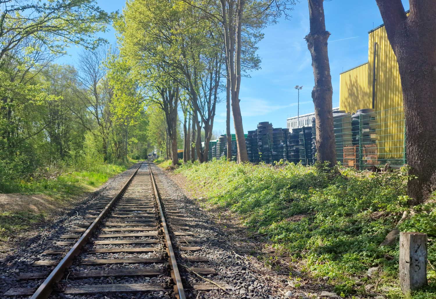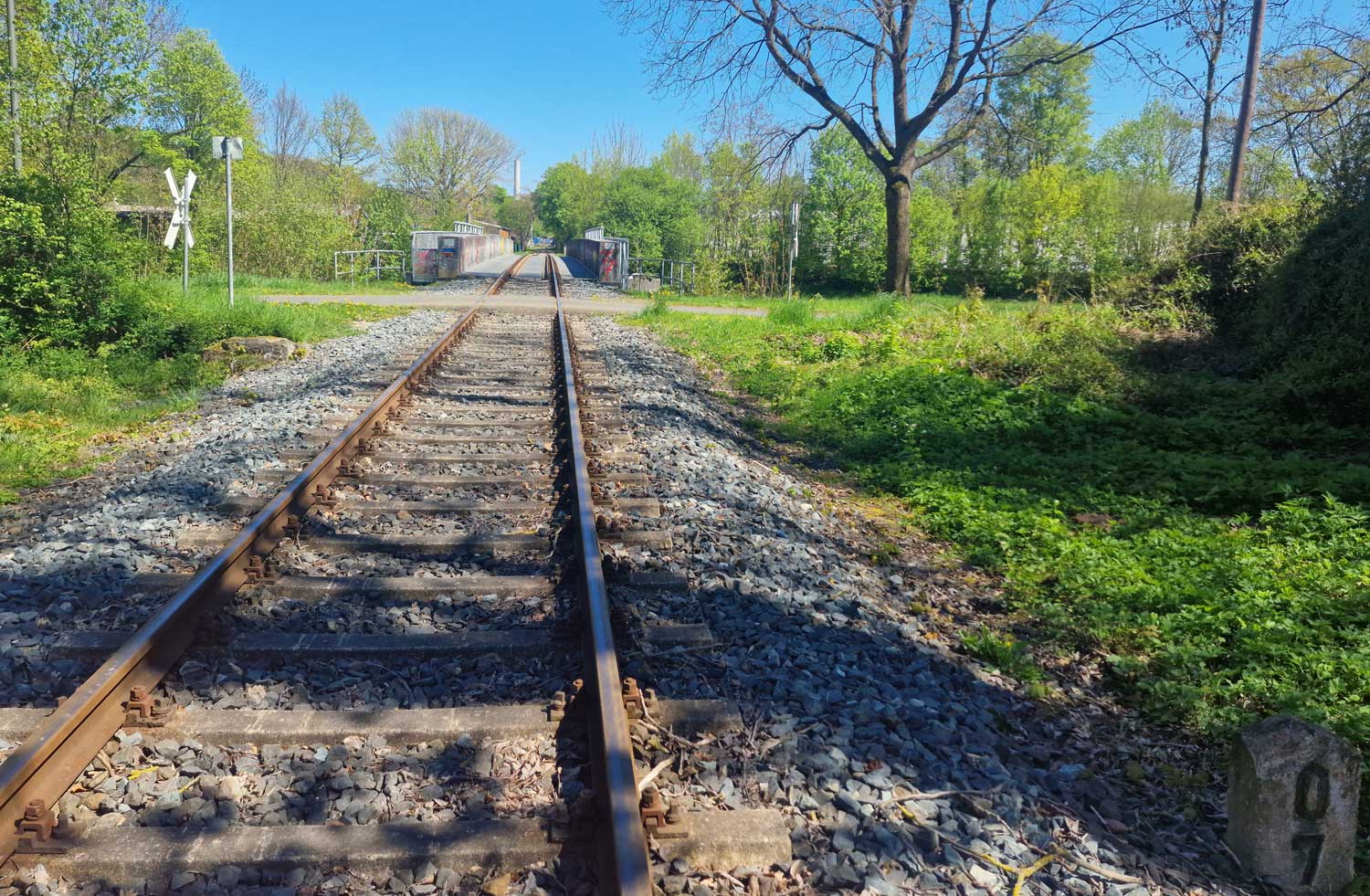 Links das Gleis der Göttinger Industrieanschlußbahn mit der Weichenverbindung zum Hauptgleis