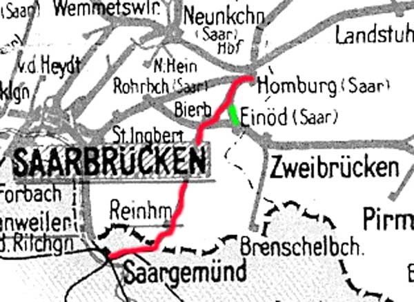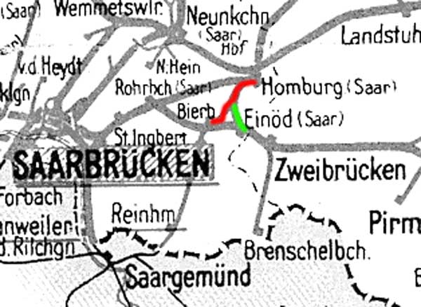 Auszug Streckenkarte 1938 Quelle: [1] Homburg (Saar) 0,0 - Schwarzenacker 5,69 - Bierbach 9,11
