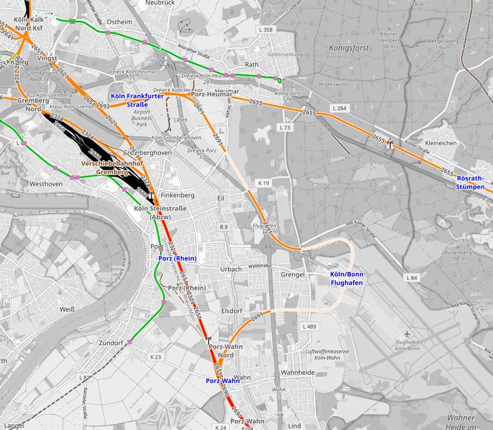 Abzw Köln Flughafen Nordwest, W 401, km 5,531 - Porz-Wahn, W 314, km 20,706 (2691)