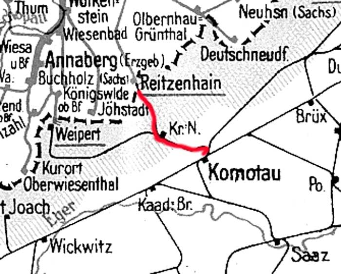 Komotau 0,0 - Krima 22,773 - Reitzenhain (Böhmen) 35,621 - Grenze Sudetenland/Deutschland 35,860 = km 0,0 - Reitzenhain 1,39 - Flöha 57,92
