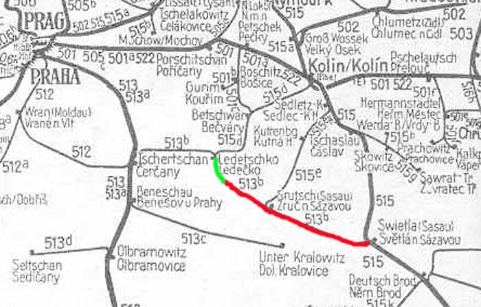 Ledetschko / Ledečko 0,0 - Rattaj Ausweiche / Ratais (Sasau) Haltestelle / Rataje nad Sázavou 1,278 - Rataje nad Sázavou zastávka 1,374 - Katzow / Kácov 16,554 = km 0,0 - Srutsch (Sasau) / Zruč nad Sázavou 13,954 - Swietla (Sasau) / Světlá nad Sázavou 47,977