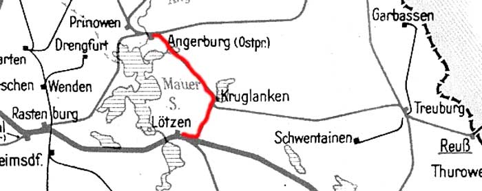 | Angerburg (Ostpr) | 34,64 | km 38,75 der Strecke Gerdauen 0,0 - Angerburg (Ostpr) 38,75 - Goldap 86,63 |