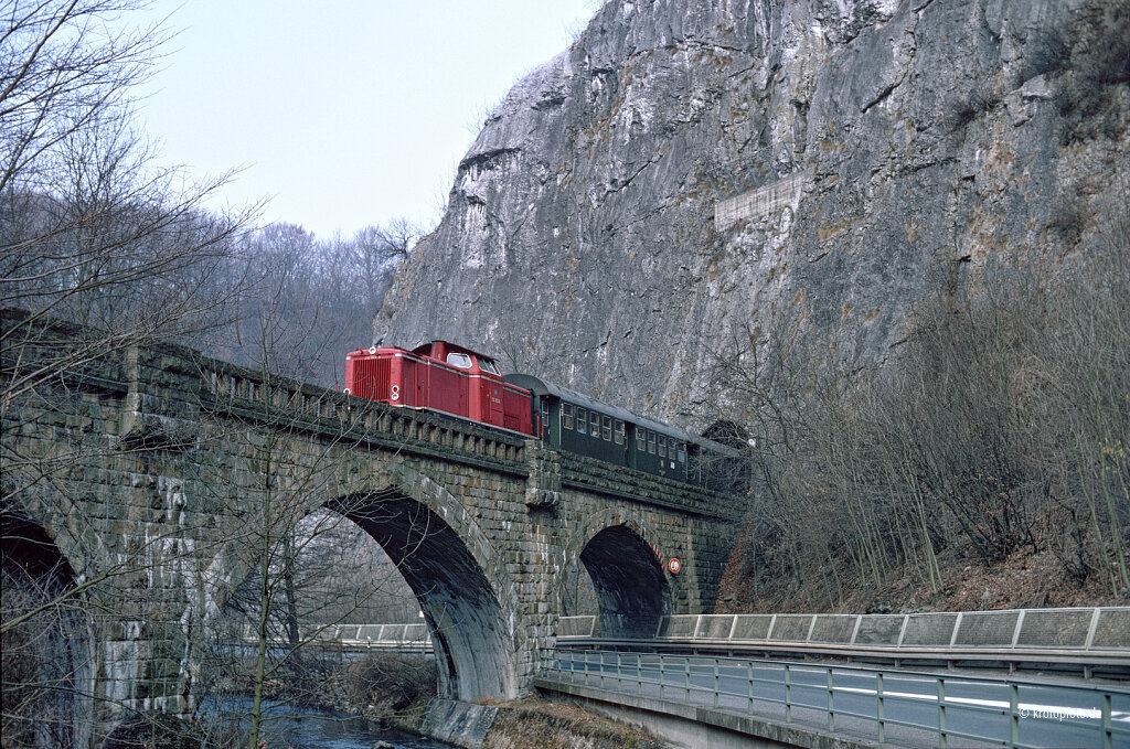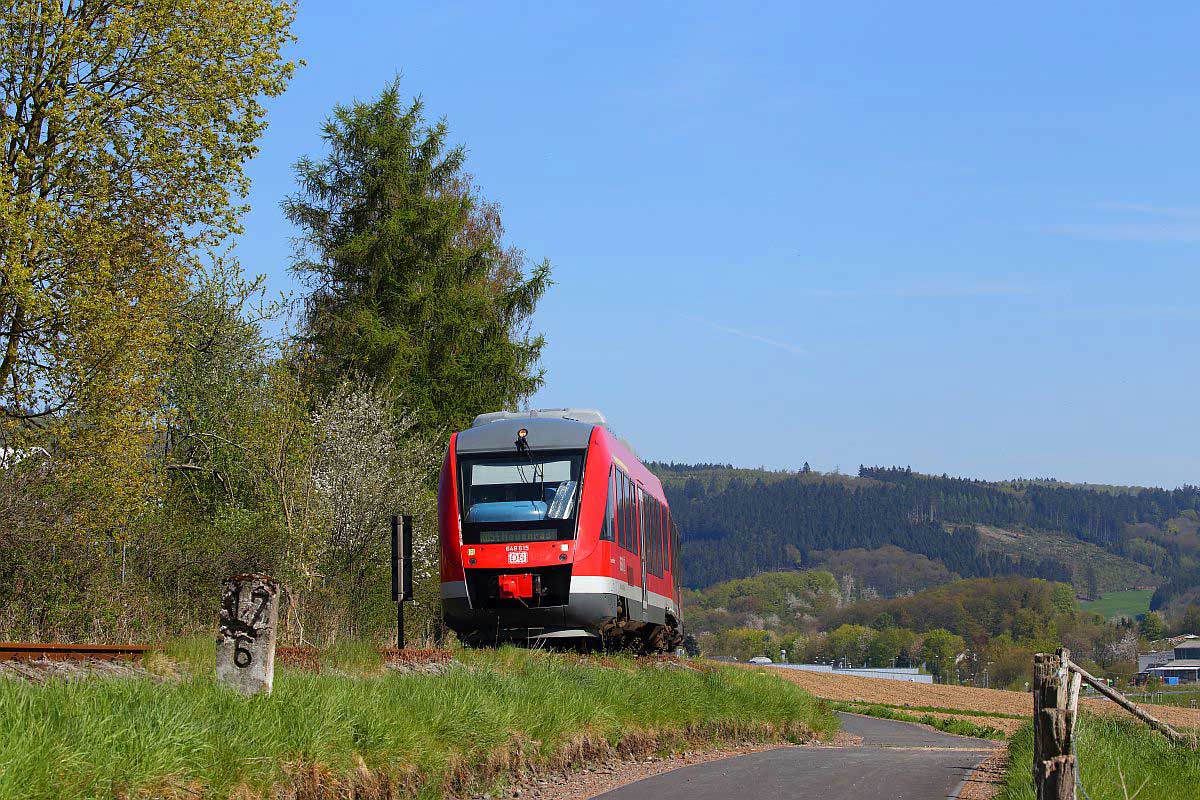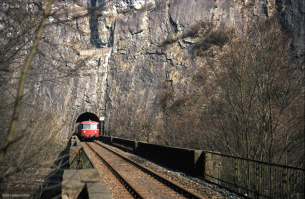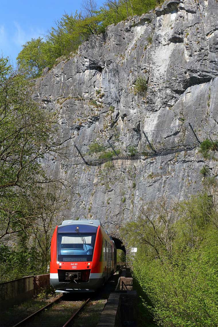 Die Garnitur 998 704/998 087/798 515 hat den Uhu-Tunnel durchquert und läuft nun als N 6459 (Fröndenberg- Neuenrade) in den Haltepunkt Klusenstein ein.