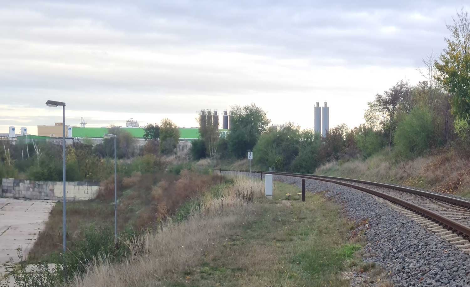 km 8,2 - Blick Richtung Leipzig-Leutzsch Rechts die abgebaute Strecke nach Leipzig-Leutzsch, links das Anschlussgleis der Mitteldeutschen Umwelt- und Ensorgungs GmbH Foto: Dietmar Levie, 07.11.2022