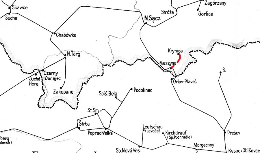 | Muszyna | 0,0 | km 138,137 der Strecke Tarnow 0,0 - Stroze 56,782 - Neu Sandez 87,522 - Muszyna - Leluchow 145,420 - Grenze Ostbahn/Slowakei 145,741 - Orlov-Plaveč - Preov - Kysak |