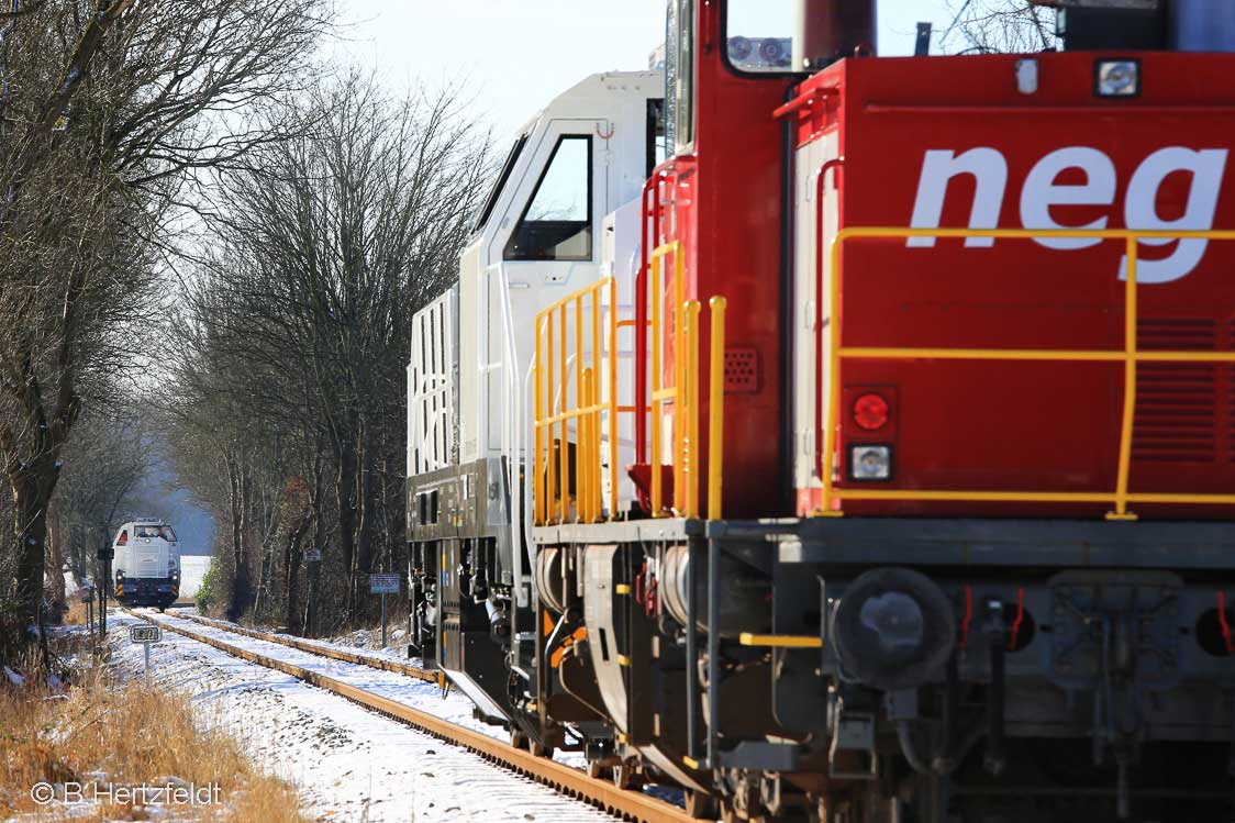 Lokomotiven statt. Nach einer Rechtskurve erreicht der Zug die Ladestelle Schusterkrug, die zum Stadtteil Holtenau gehört. Direkt dahinter führt die Strecke in das ehemalige Militärgelände Voßbrook. Hier liegt eine Spitzkehre, wo die Loks umsetzen müssen. Nachdem das ehemalige Militärgelände wieder verlassen ist, passiert der Zug die Ladestelle der Lindenauwerft. Nach der Durchfahrt durch Friedrichsort erreicht der Zug das Vossloh-Werkgelände. |