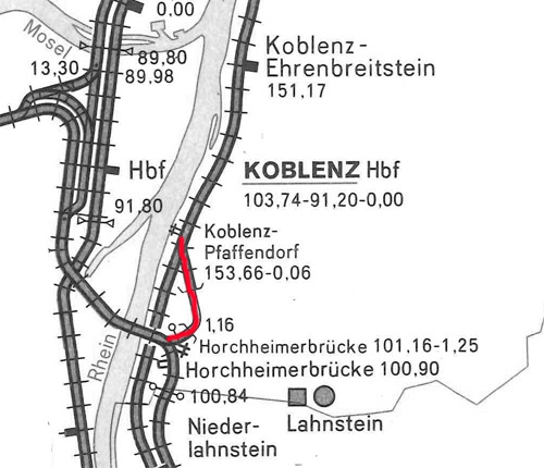 | Abzw Horchheimer Brücke | 1,37 | km 101,16 der Strecke Wetzlar 0,01 - Limburg (Lahn) 52,21 - Koblenz Hbf 103,74 |
