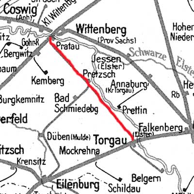 | Torgau | 41,87 | km 77,02 der Strecke Halle (Saale) Hbf -0,31 - Eilenburg 49,28 - Falkenberg (Elster) (oben) 95,07 - Cottbus 173,90 - Guben 211,54 |