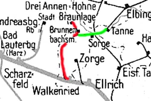 | Sorge SHE | 5,11 | km 34,15 der Strecke Nordhausen Nord 0,0 - Eisfelder Talmühle 17,29 - Drei Annen Hohne 46,44 - Wernigerode 60,48 mit Verbindungsgleis zur SHE |