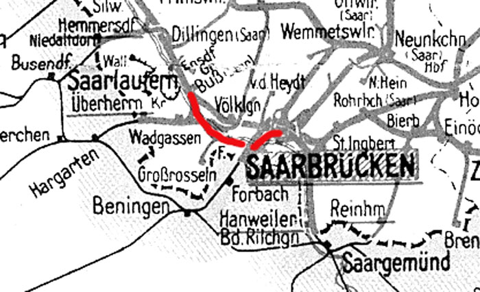 | km 26,109 der Strecke Grenze Bayern/Preußen bei Bexbach 0,0 - Neunkirchen (Saar) 4,873 - Saarbrücken Hbf 26,109 - Direktionsgrenze Saarbrücken/Lothringen 31,640 = km 51,363 - Forbach 47,165 - Beningen (Lothr) 38,919 - Remelach 0,0 | ||