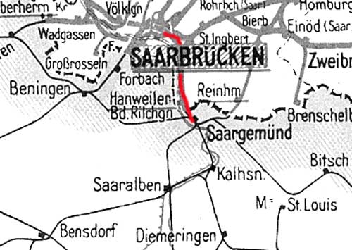 Saarbrücken Hbf 0,0 - Brebach 4,491 - Hanweiler16,001 - Direktionsgrenze Saarbrücken/Lothringen 16,934 = km 1,043 - Saargemünd 0,0 (auch Angabe km 17,972 von Saarbrücken Hbf) (1914/1917)