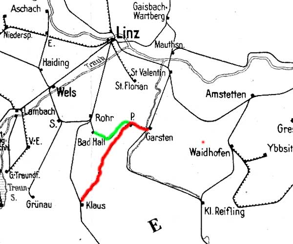Garsten 0,0 - Steyr Lokalbahnhof 2,7 - Pergern 6,7 - Grünburg 19,2 - Klaus 39,8