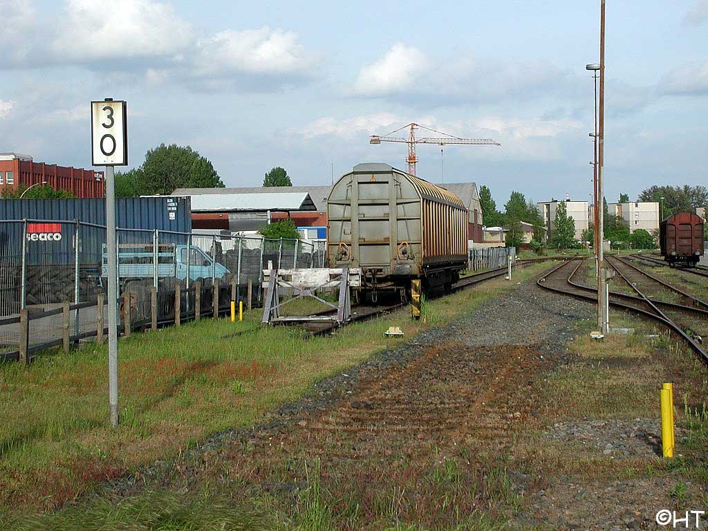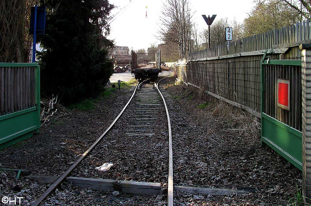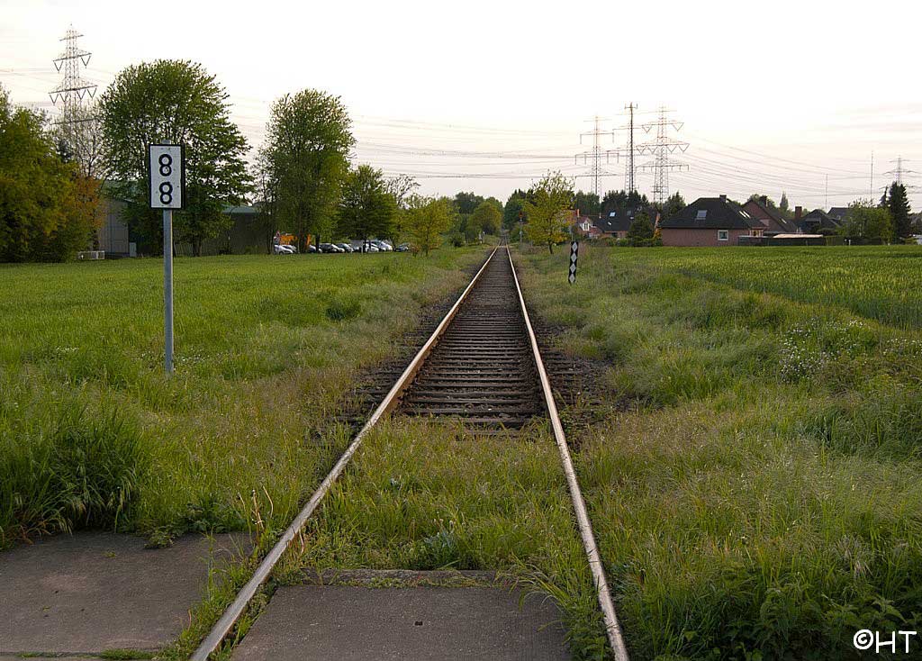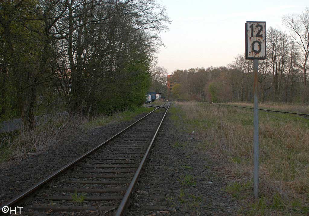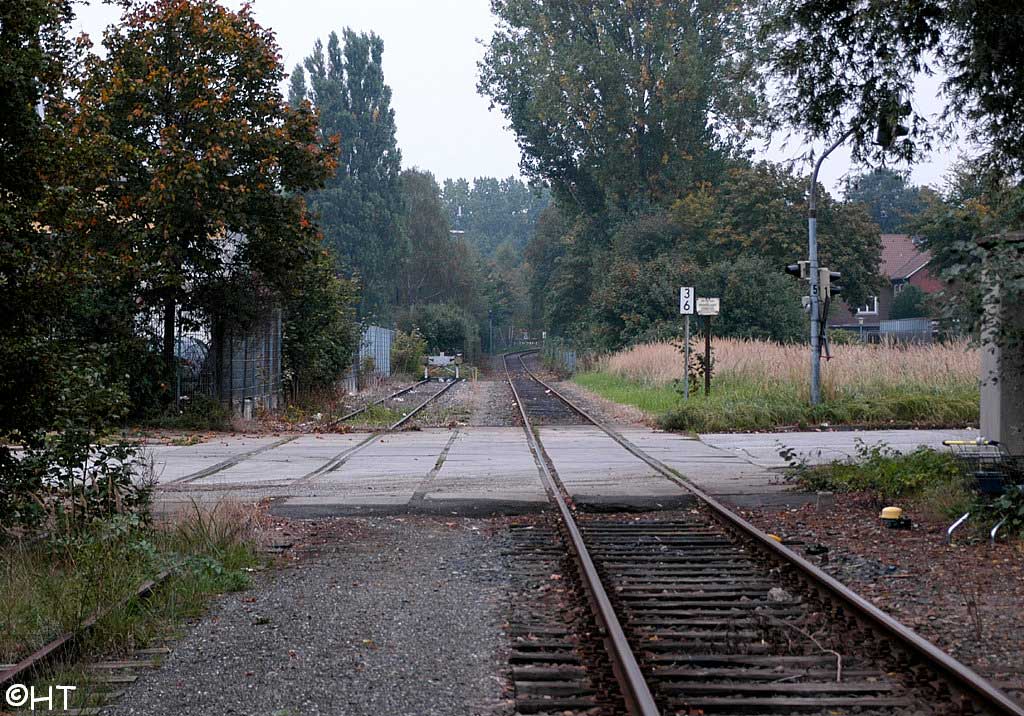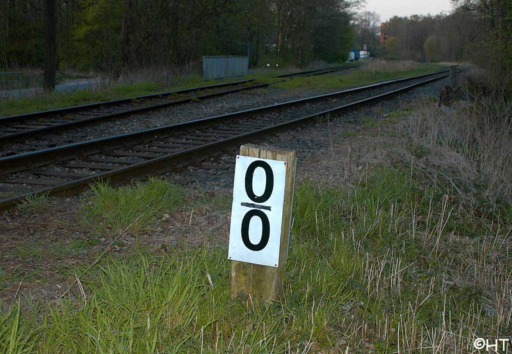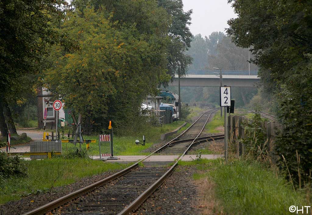 km 2,0 befindet sich inzwischen auf dem Gelände von Koops, rechts von den Waggons, das Gleistor ist vorverlegt worden, die Gleise zum Teil neu verlegt worden.