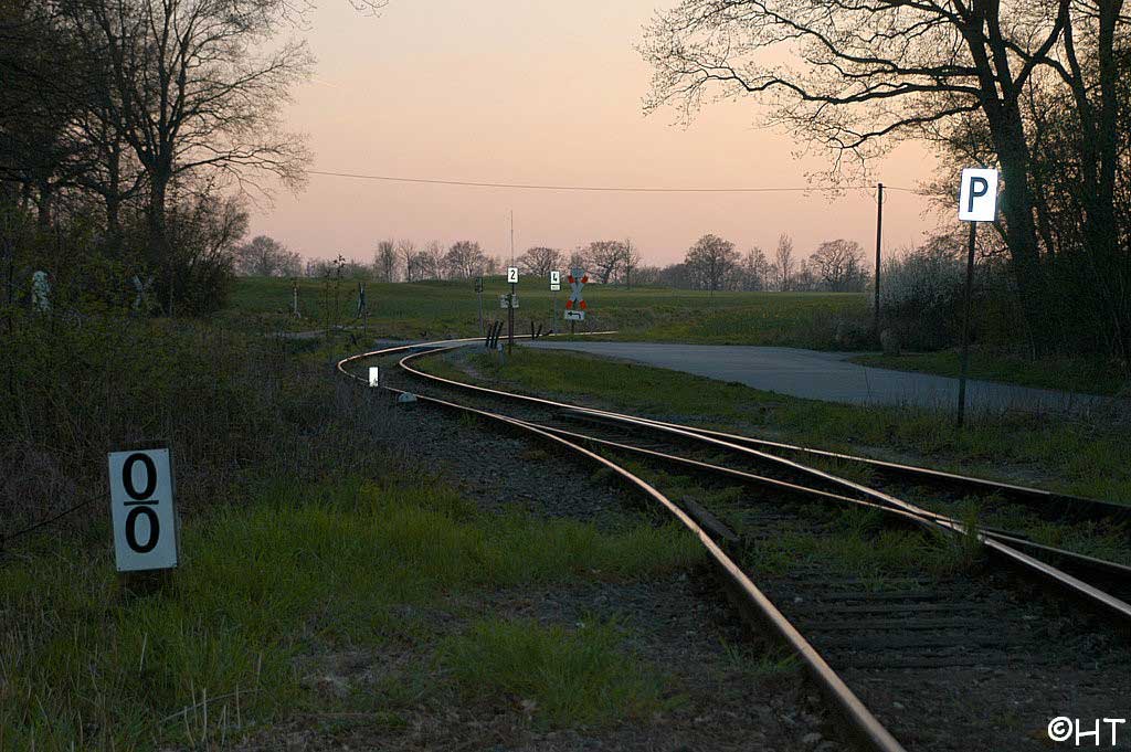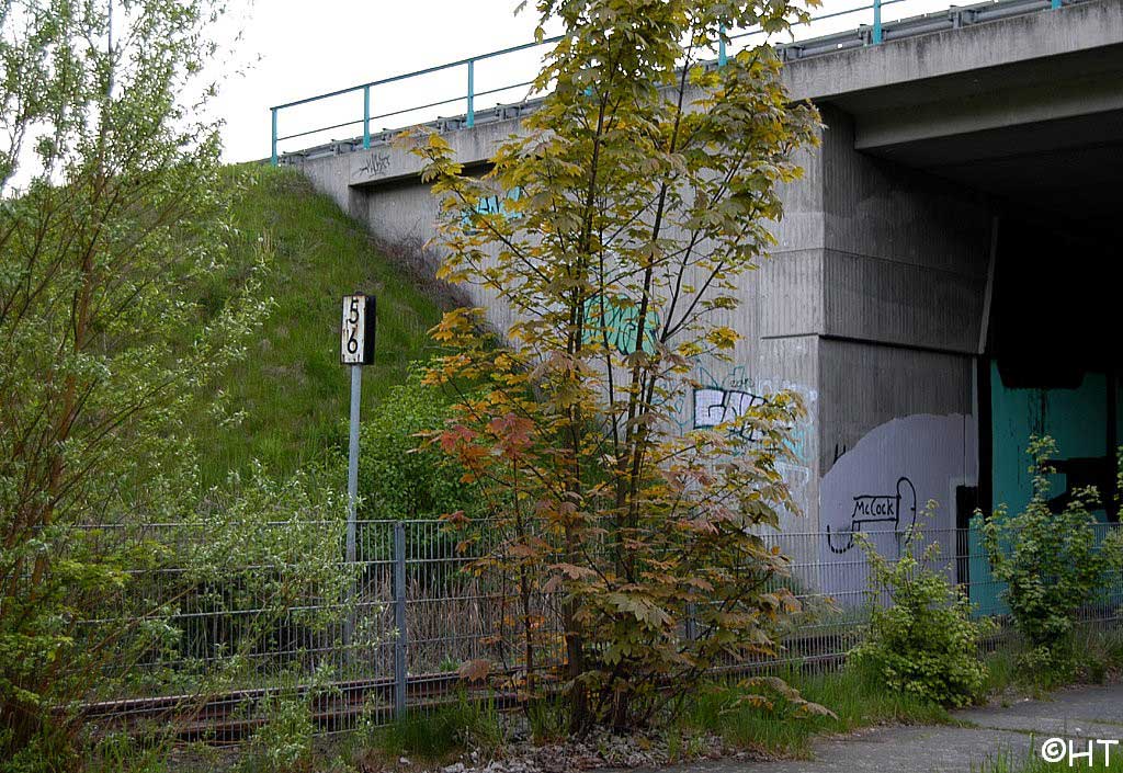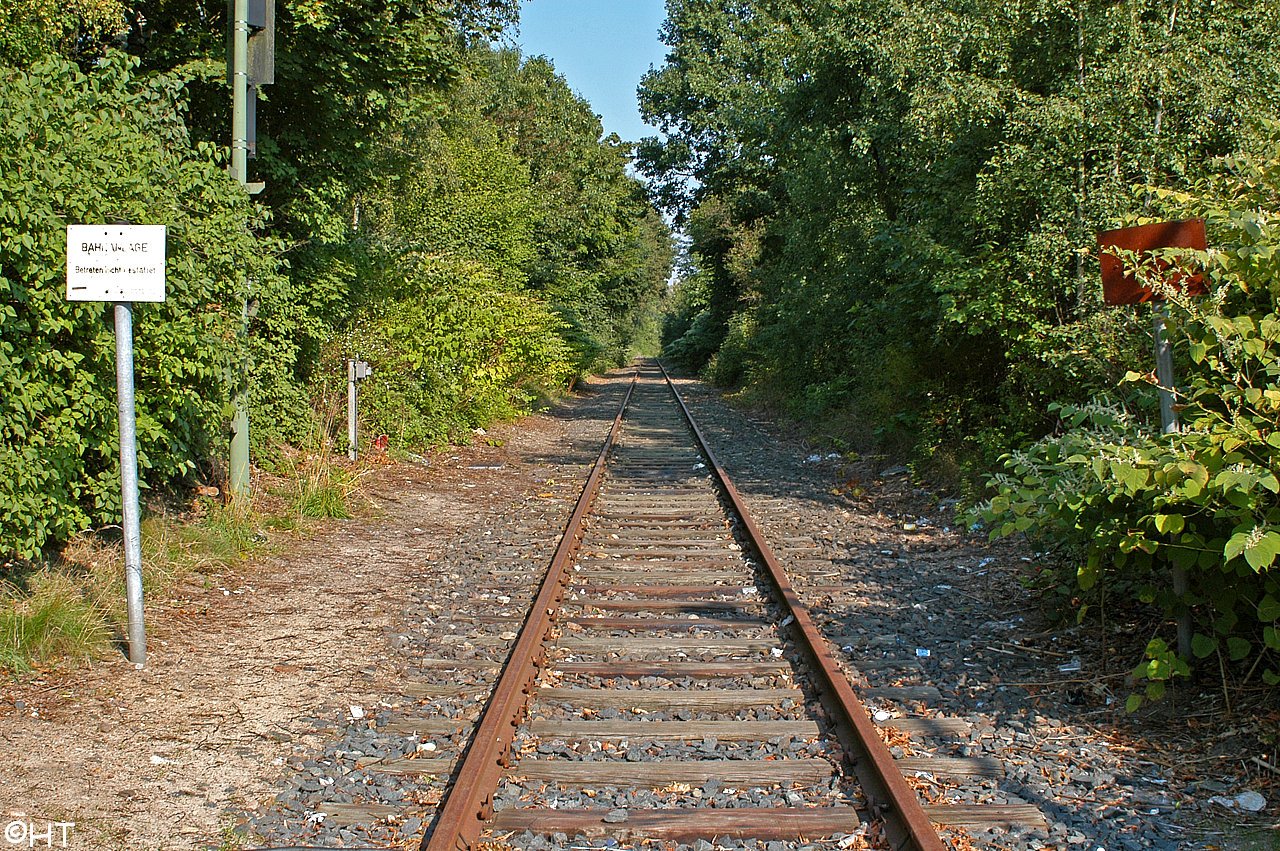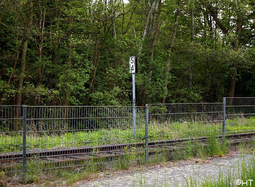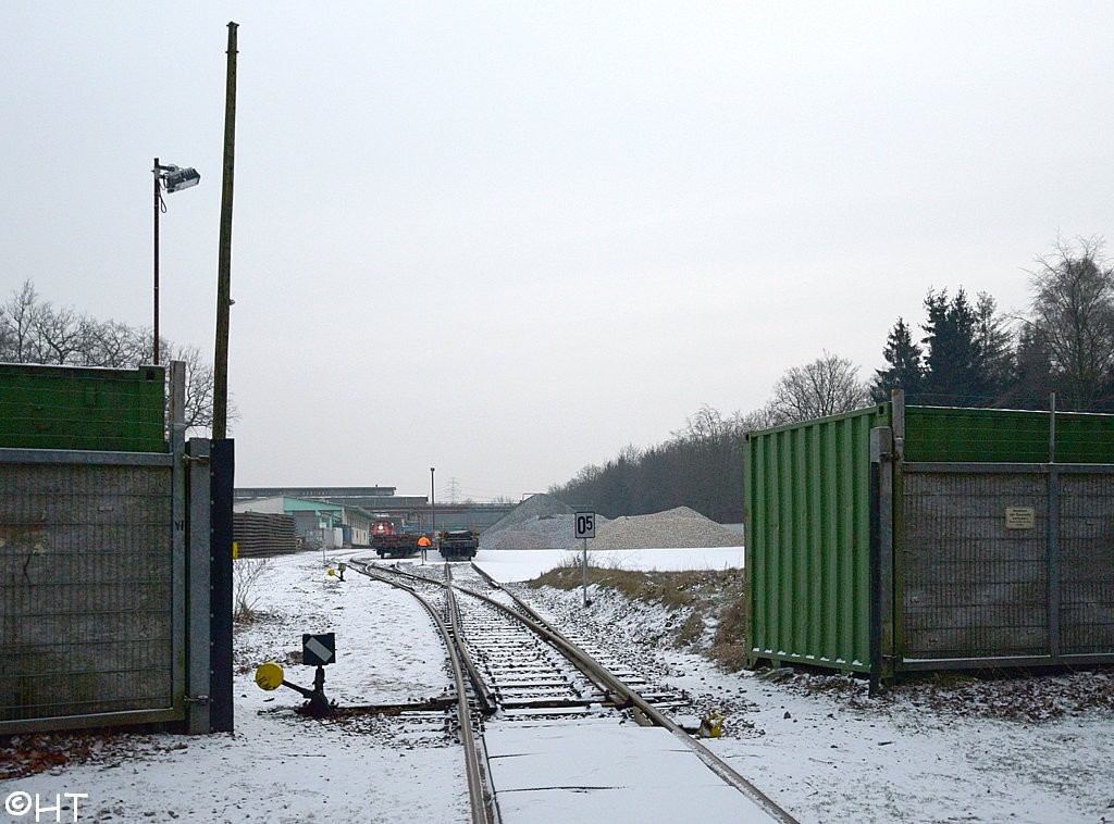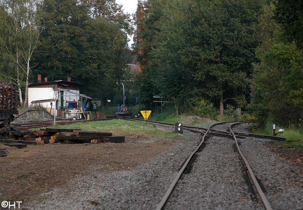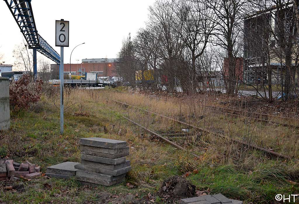 km 2,0 befindet sich inzwischen auf dem Gelände von Koops, rechts von den Waggons, das Gleistor ist vorverlegt worden, die Gleise zum Teil neu verlegt worden.