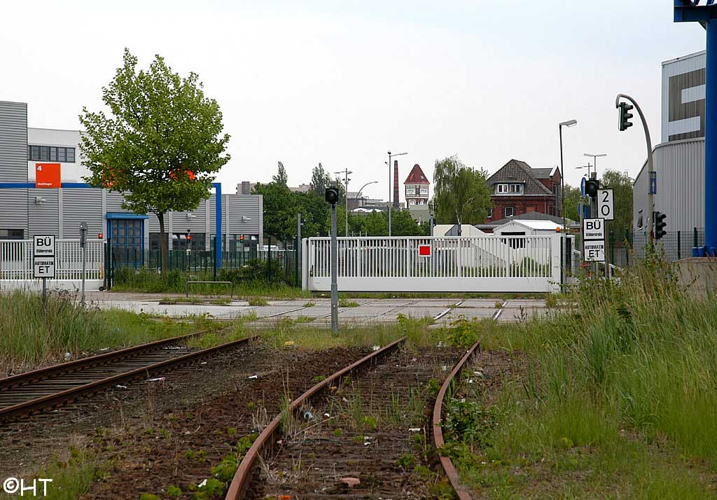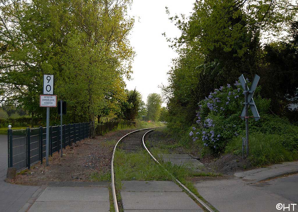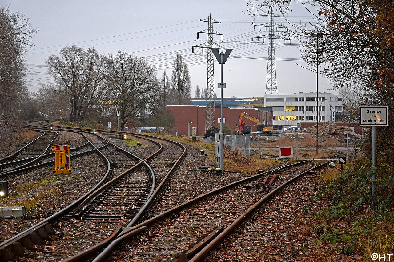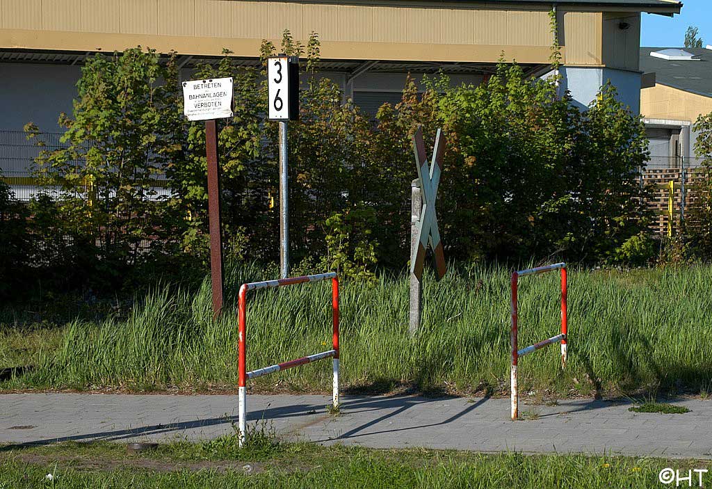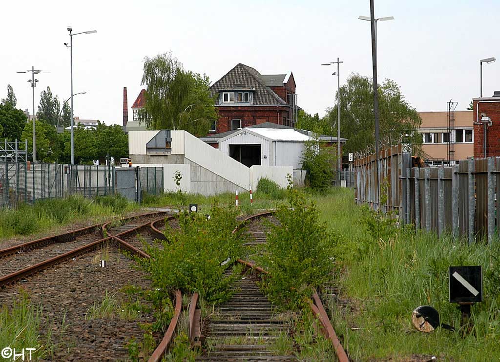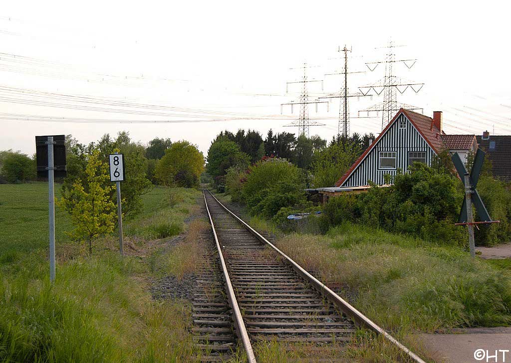km 2,0 befindet sich inzwischen auf dem Gelände von Koops, rechts von den Waggons, das Gleistor ist vorverlegt worden, die Gleise zum Teil neu verlegt worden.