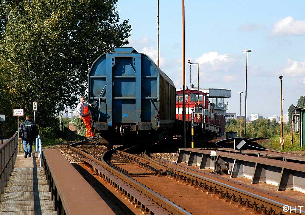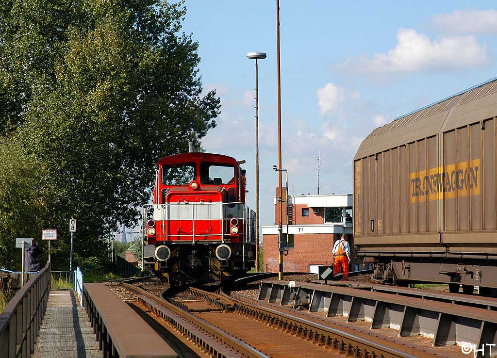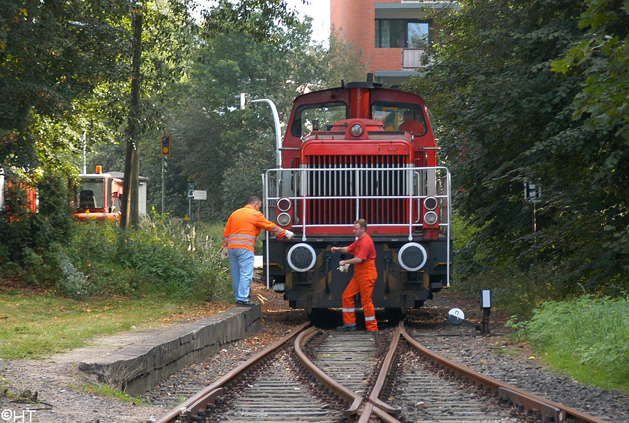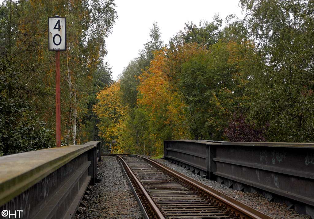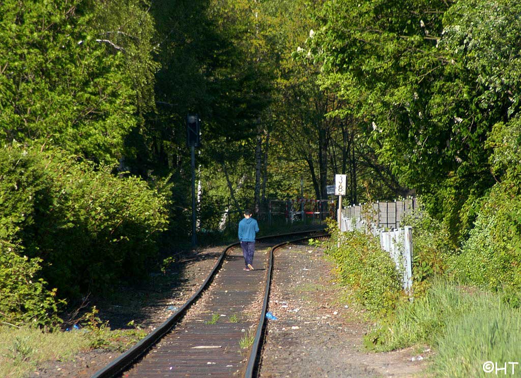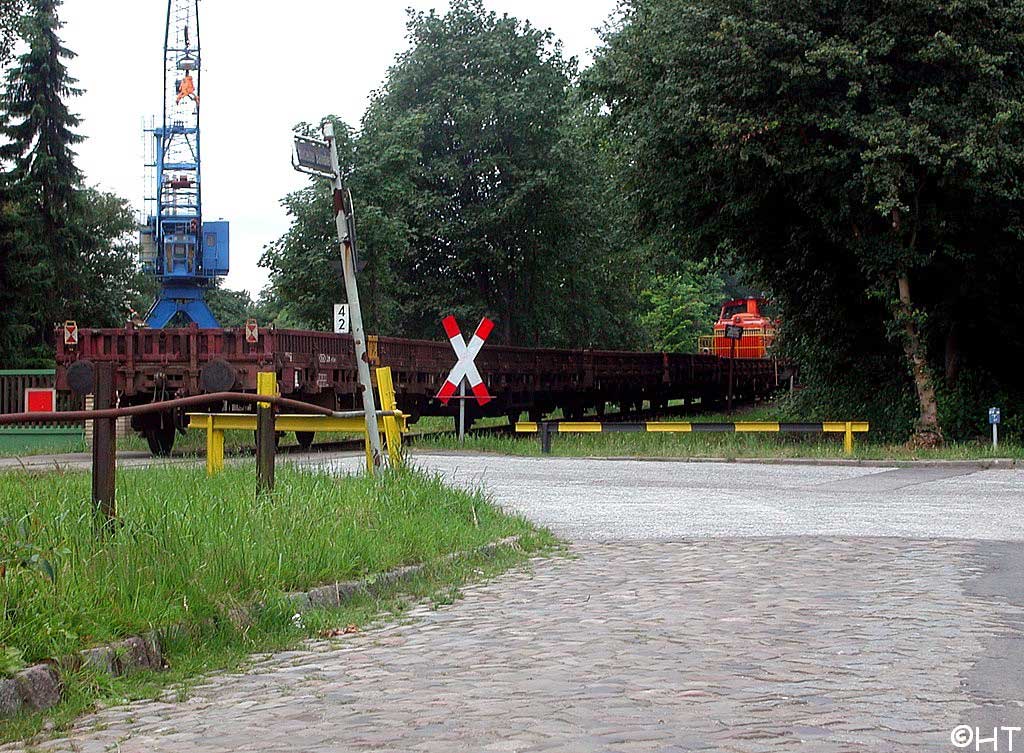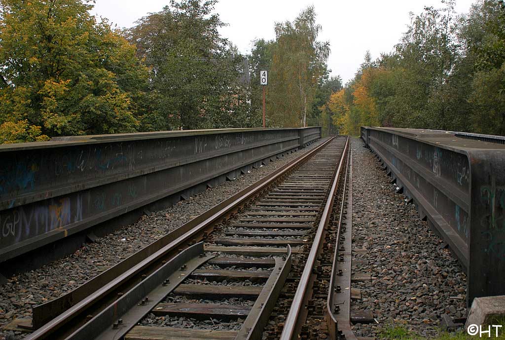 km 2,0 befindet sich inzwischen auf dem Gelände von Koops, rechts von den Waggons, das Gleistor ist vorverlegt worden, die Gleise zum Teil neu verlegt worden.