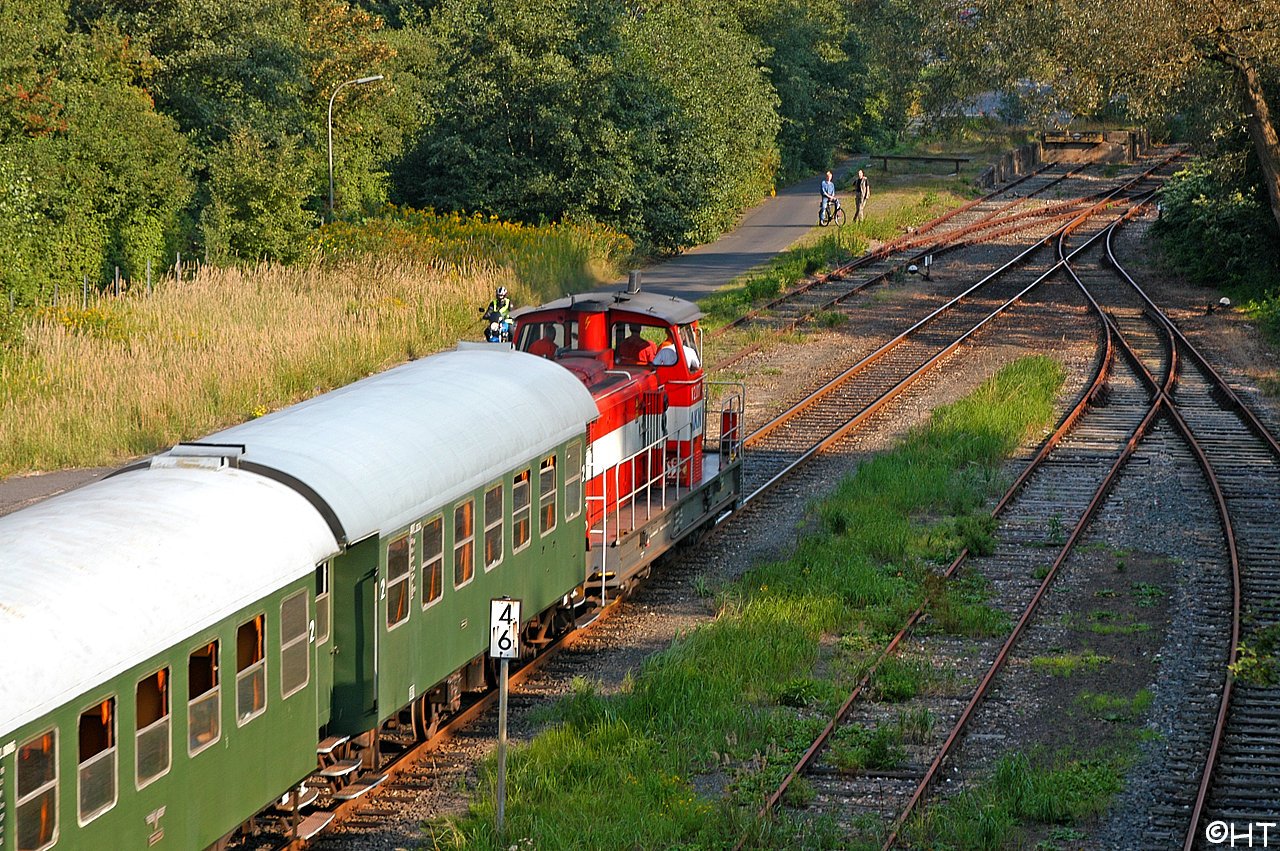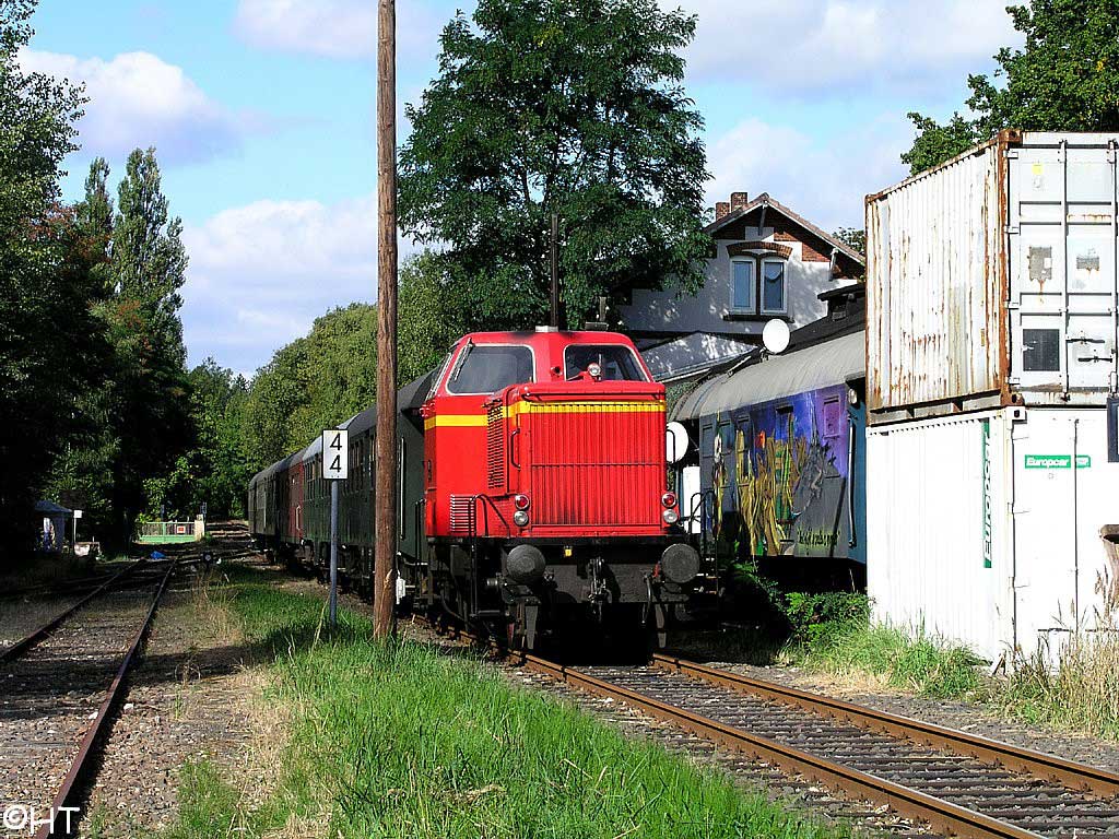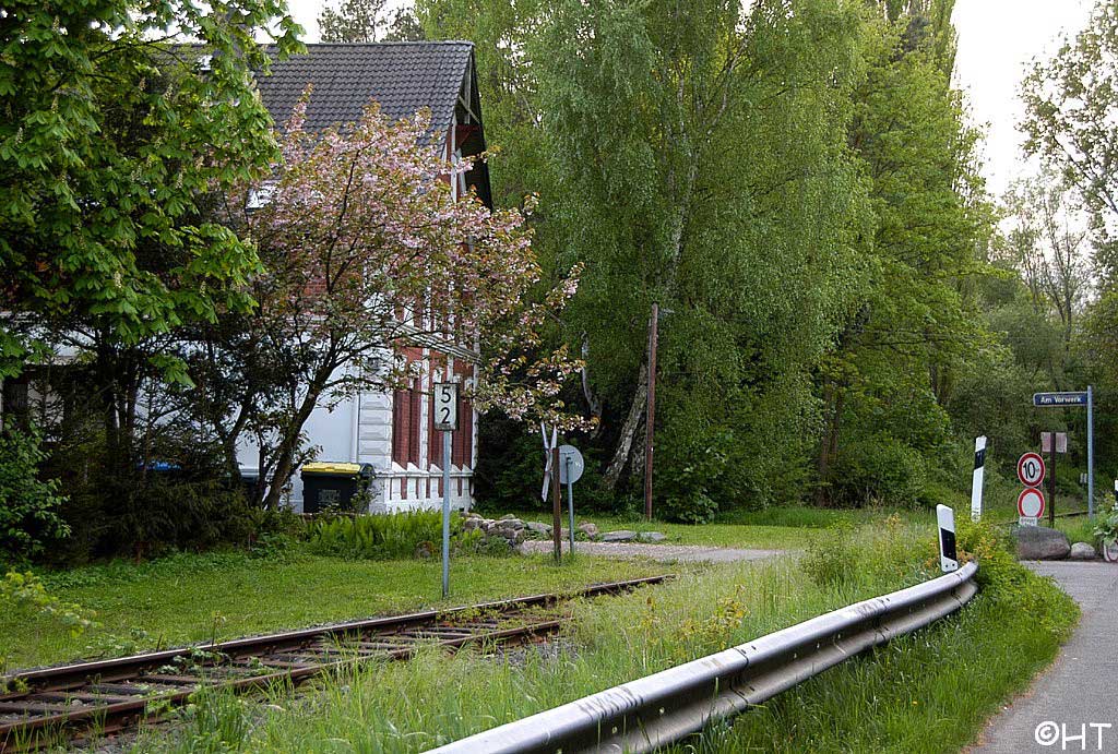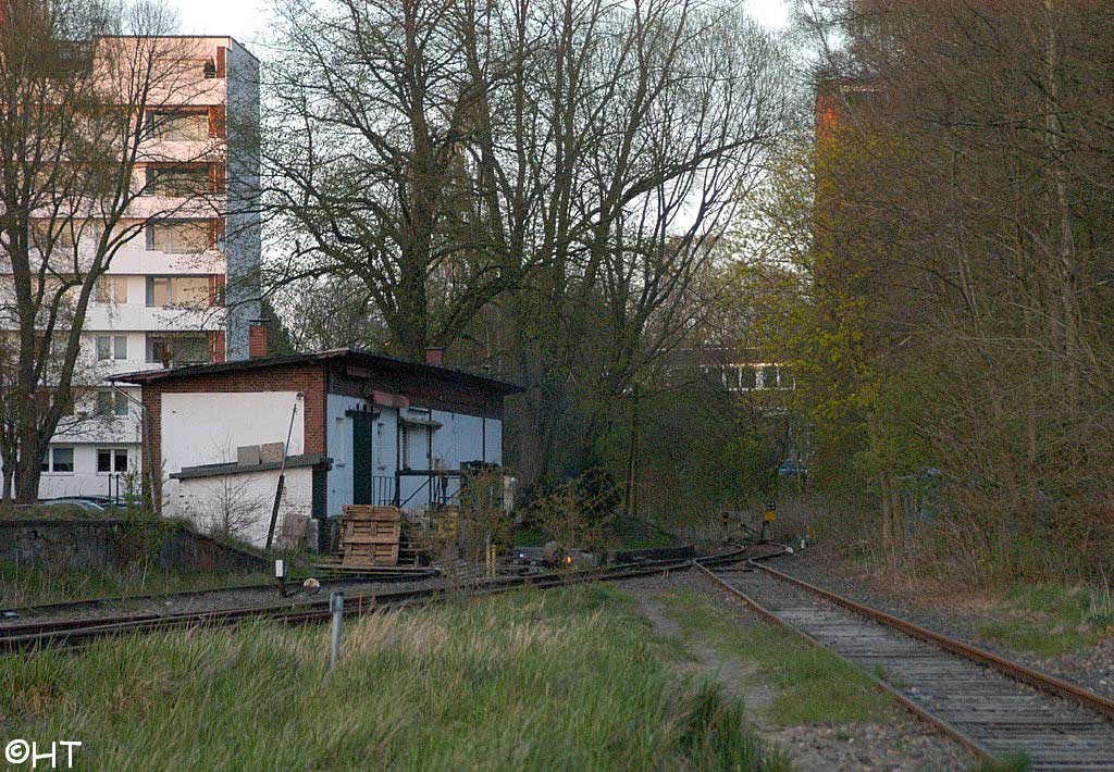 Rechts zwischen kleinem Wall und Böschung die gleislose, hier ungenutzte Trasse nach Bad Oldesloe,