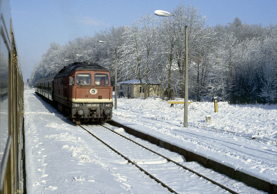 km 0,1 in Toitz-Rustow 232 451 befindet sich auf der Strecke der Nordbahn Foto: Dieselkutscher, 1993 Loitz Foto: Jens Mehlhorn, 2018