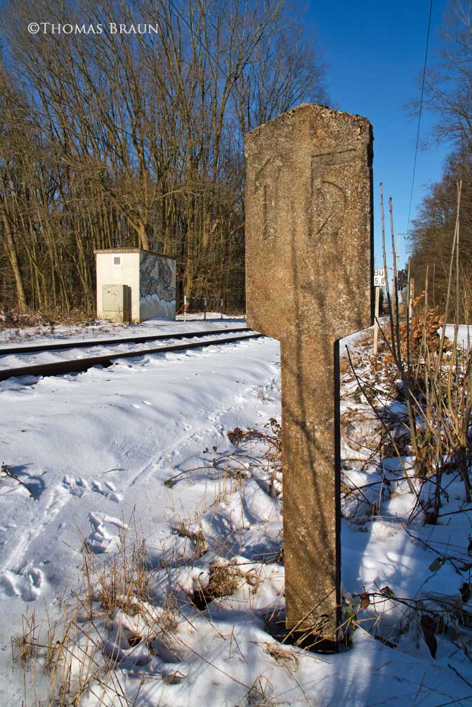 km 0,0 (Stein und wahrscheinlich alter Stein mit +/- 0) in Viersen - Blick Richtung Streckenanfang