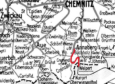 Vejprty (Weipert) 0,0 - Grenze Tschechoslowakei/Deutschland 0,578 - Bärenstein (Kr Annaberg) 0,91 - Annaberg (Erzgeb) unt Bf 19,04 (WA)