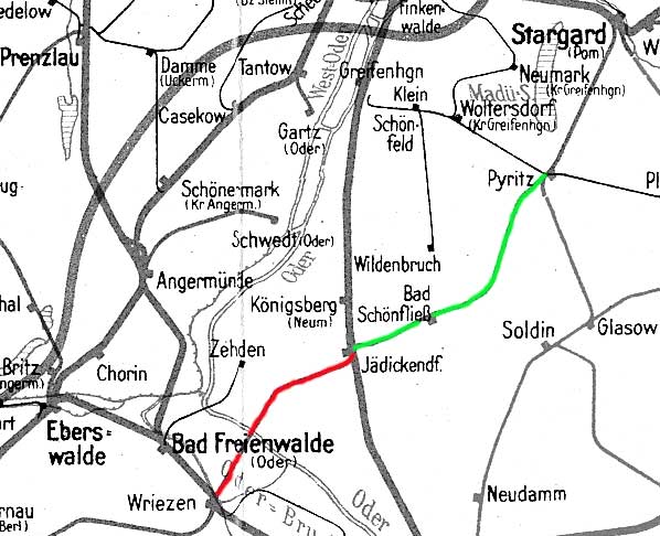 Wriezen 0,0 - Neu Rüdnitz 8,30 - Grenze DDR/Polen km 12,3 = km 93,5 - Siekierki (Zäckerick-Alt Rüdnitz) 92,340 - Godków (Jädickendorf) 71,917 - Pyrzyce (Pyritz) 24,992 - Stargard Szczeciński [Stargard (Pom)] 0,0