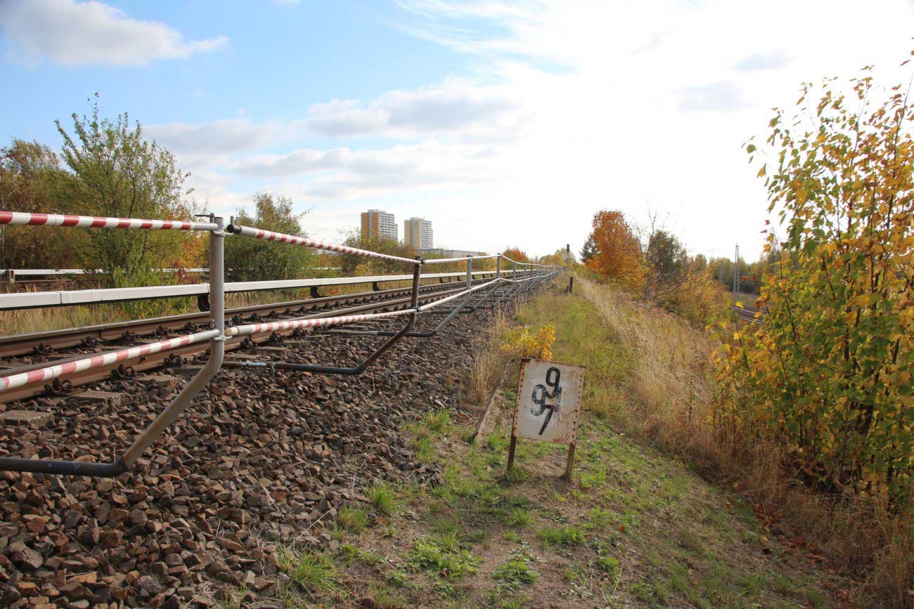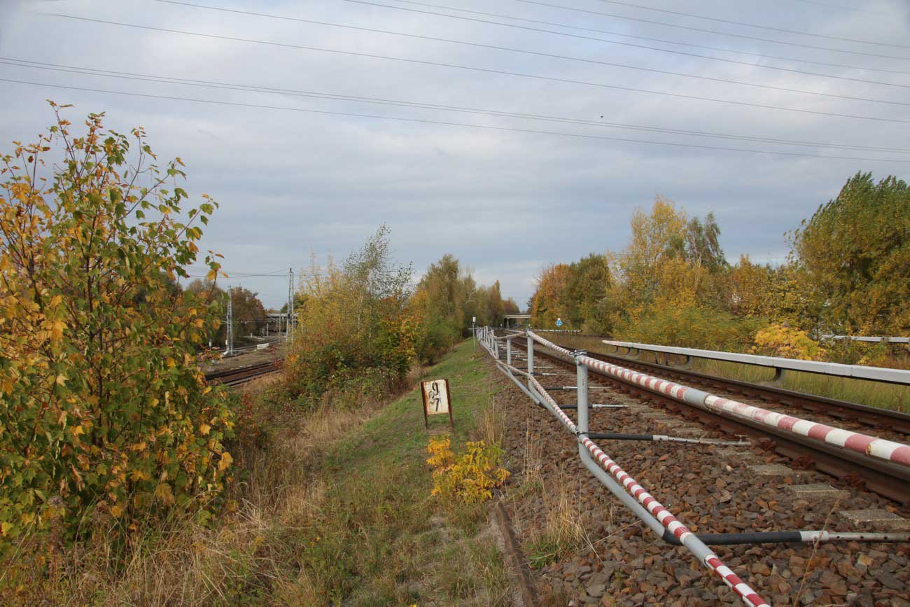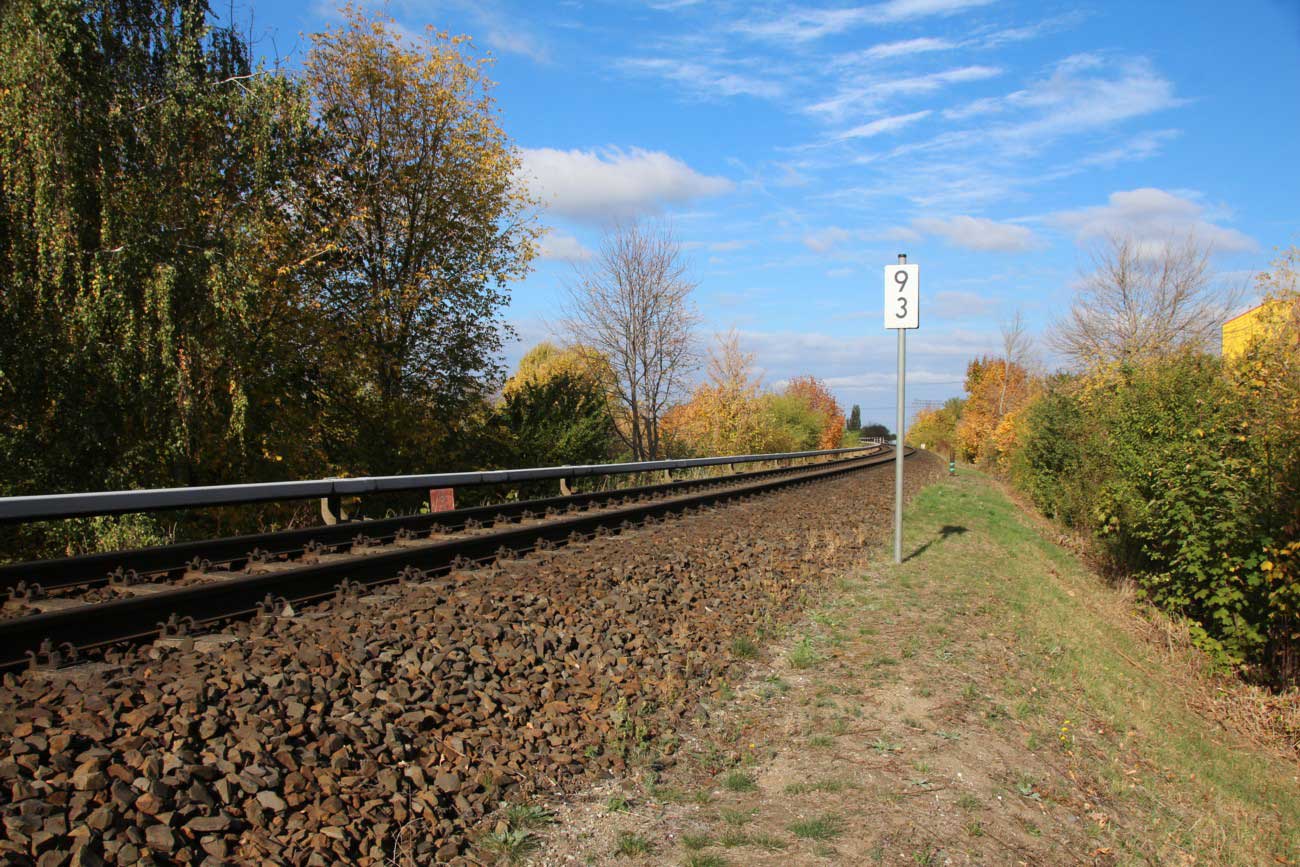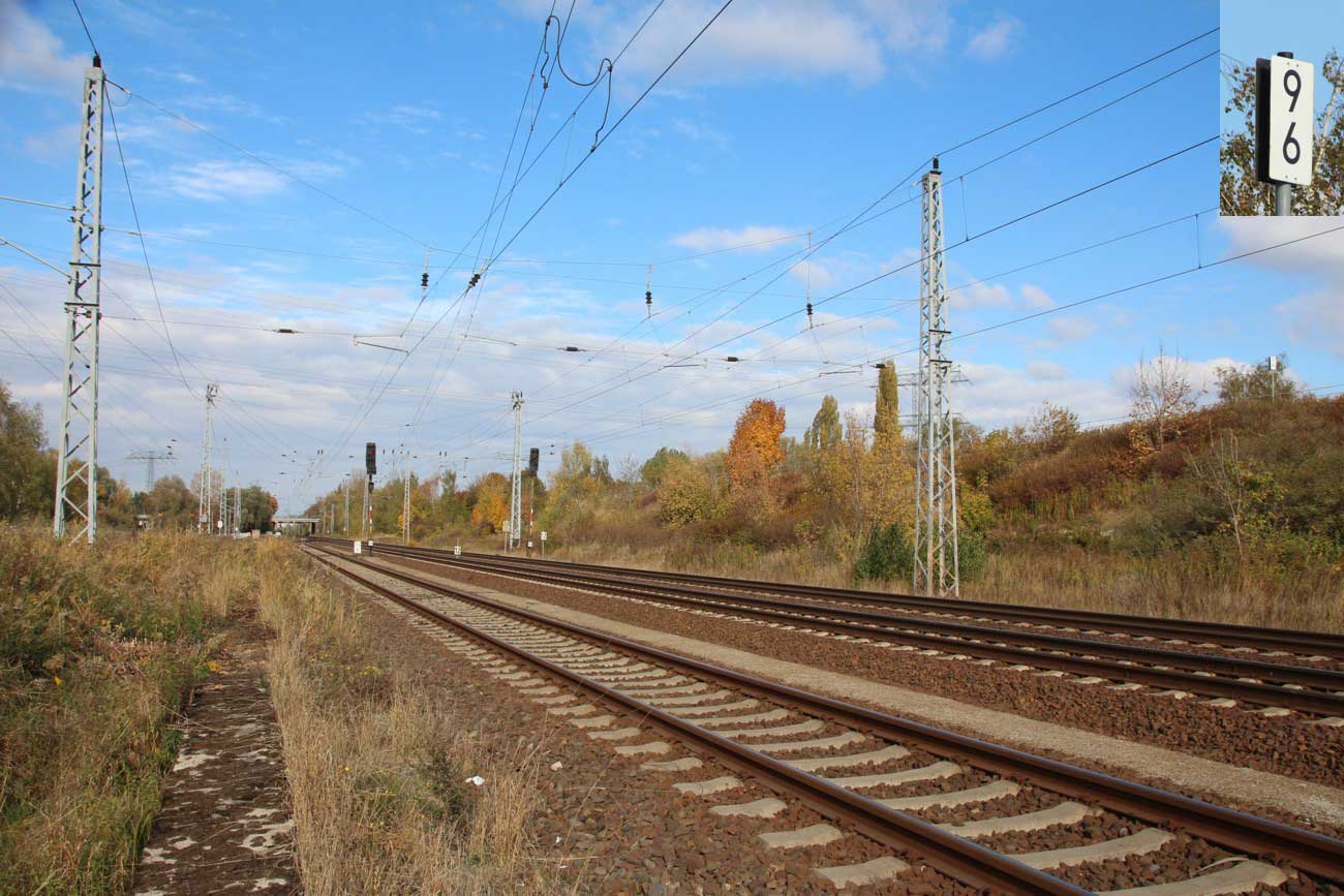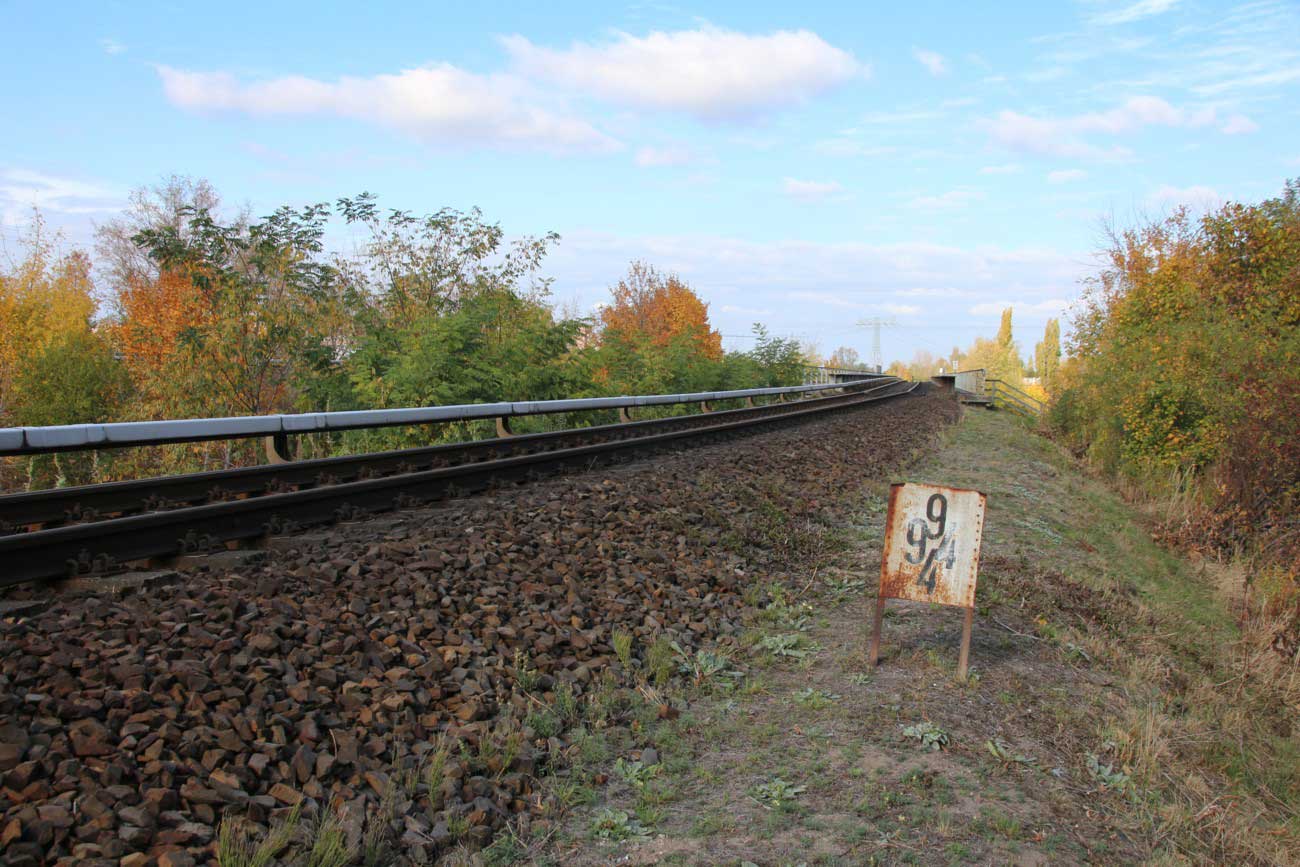 Mittig die beiden Gleise der Schlesischen Bahn mit km 10,2