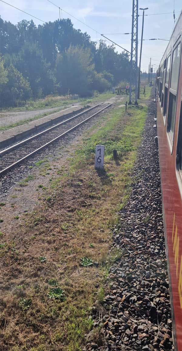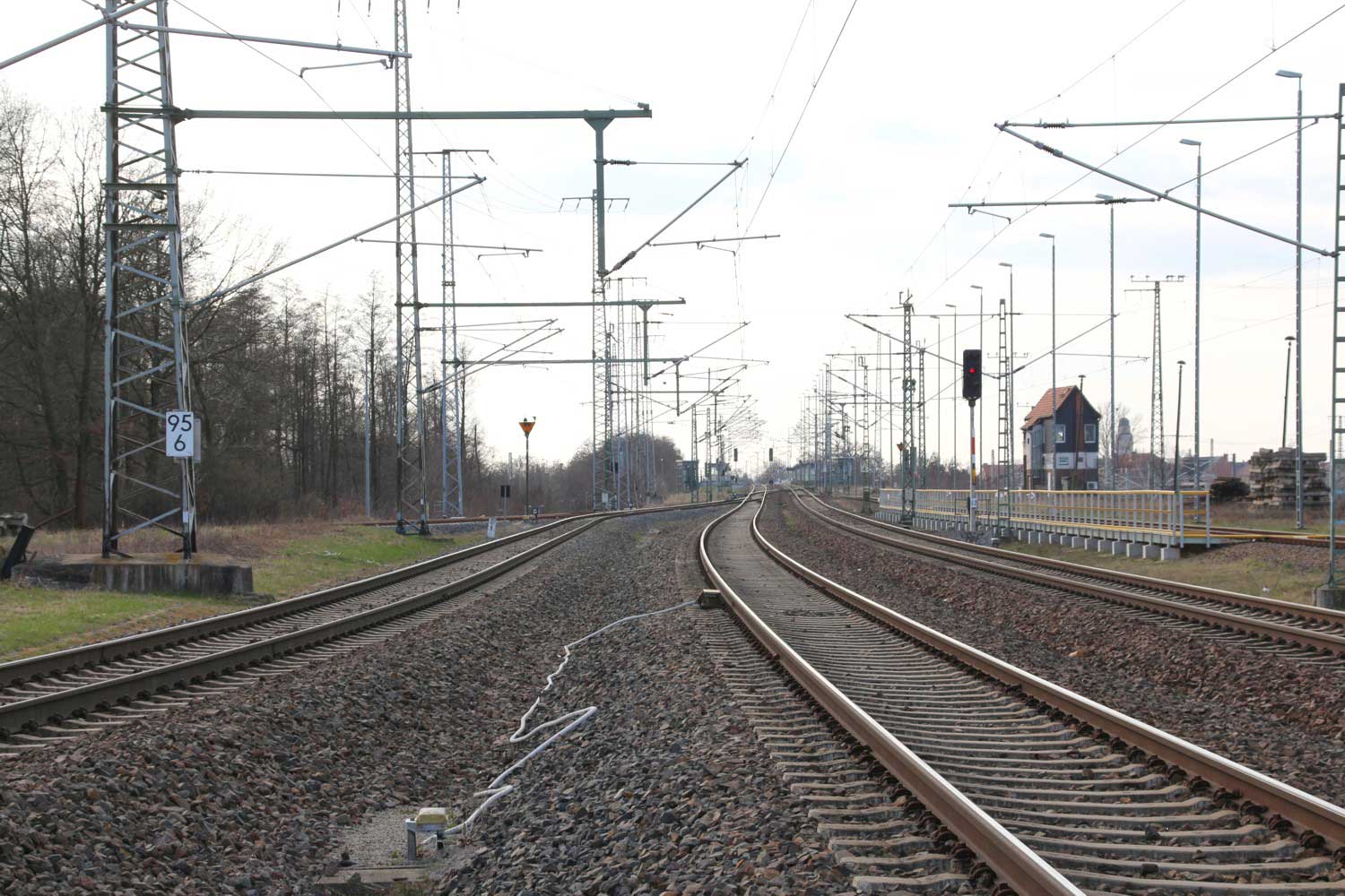 links km 95,6 der Strecke Halle (Saale) Hbf -0,31 - Eilenburg 49,27 - Falkenberg (Elster) 95,07 - Cottbus 173,86 - Guben 211,53 - Rb aus Richtung Cottbus (Guben)