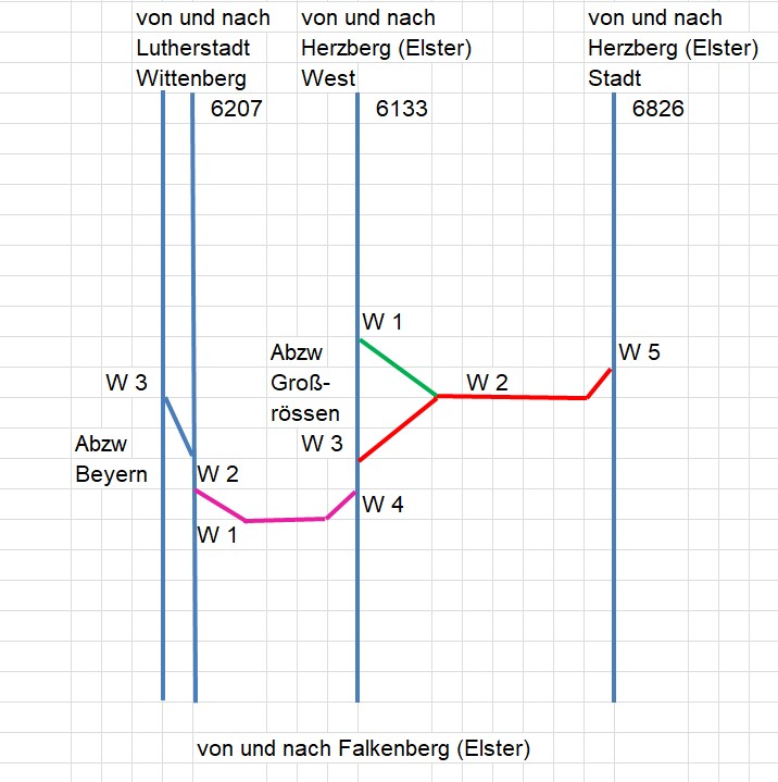 grün: Großrössen, W 2, km 2,125 - Herzberg (Elster) West, W 1, km 3,106 (6849)