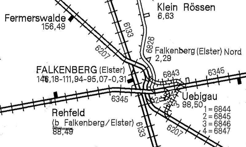 6843 | Falkenberg (Elster), Stw B 20, W 260; km -0,102 - Stw. W 2 - [Falkenberg (Elster), Stw W 5, W 703; km 1,597] |