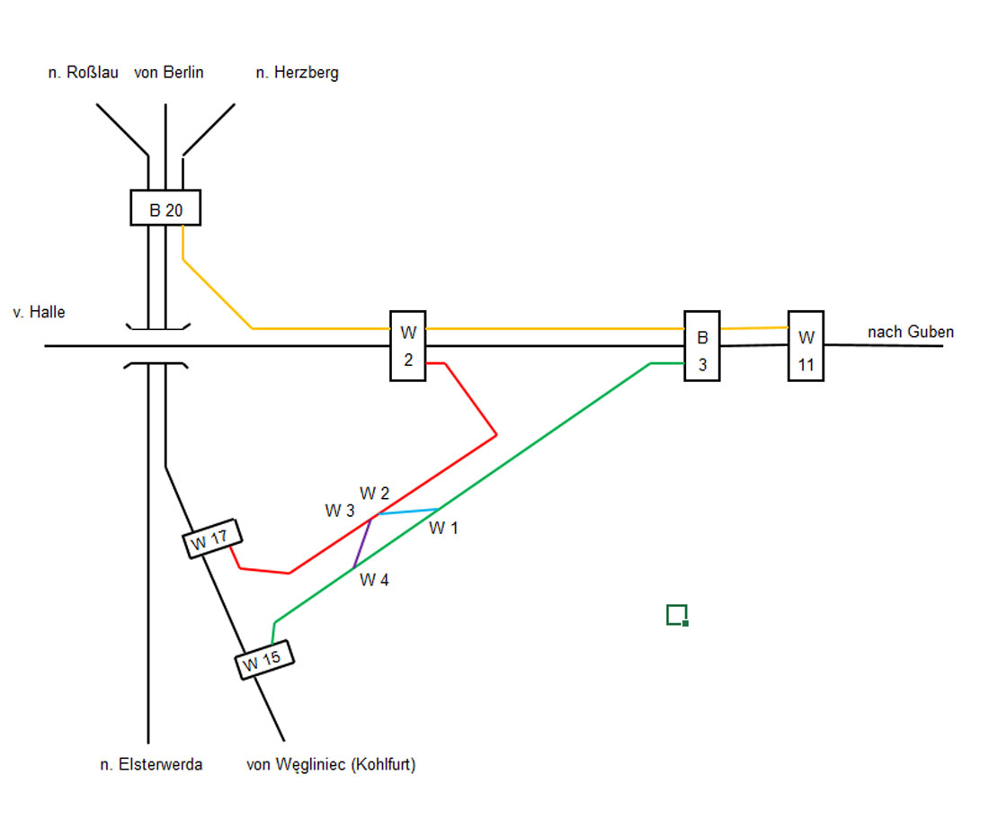 km 0,4 der Verbindungsstrecke Falkenberg (Elster), Stw B 3, W 654; km -0,017 - Weiche 1 - Weiche 4 - Falkenberg (Elster), Stw W 15, W 468; km 1,191