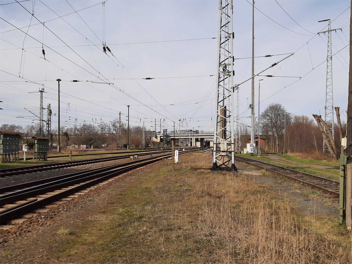 Im Hintergrund km 1,7 der Verbindungsstrecke Falkenberg (Elster), Stw W 2, W 519; km -0,021 - Weiche 2 - Weiche 3 - Falkenberg (Elster), Stw W 17, W415; km 1,714 (6845)
