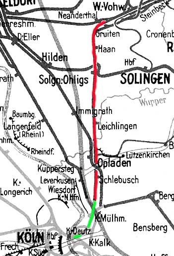 | Die BME begann den Bau ihrer neuen Strecken im Bahnhof Gruiten, heute fädelt die Strecke bereits knapp zwei Kilometer vorher an der Abzweigstelle Linden aus der Stecke von Wuppertal aus. Der erste Streckenabschnitt geradewegs nach Süden über Ohligs-Wald (später Ohligs und Solingen-Ohligs, heute Solingen Hauptbahnhof) nach Opladen wurde am 25. September 1867 eröffnet. | ||