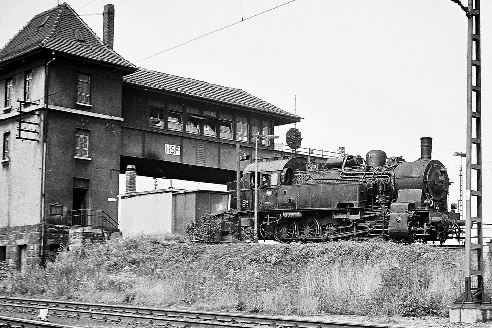 Ein Blick zurück zeigte 140 831, die aus Moers kommend am Stellwerksgebäude