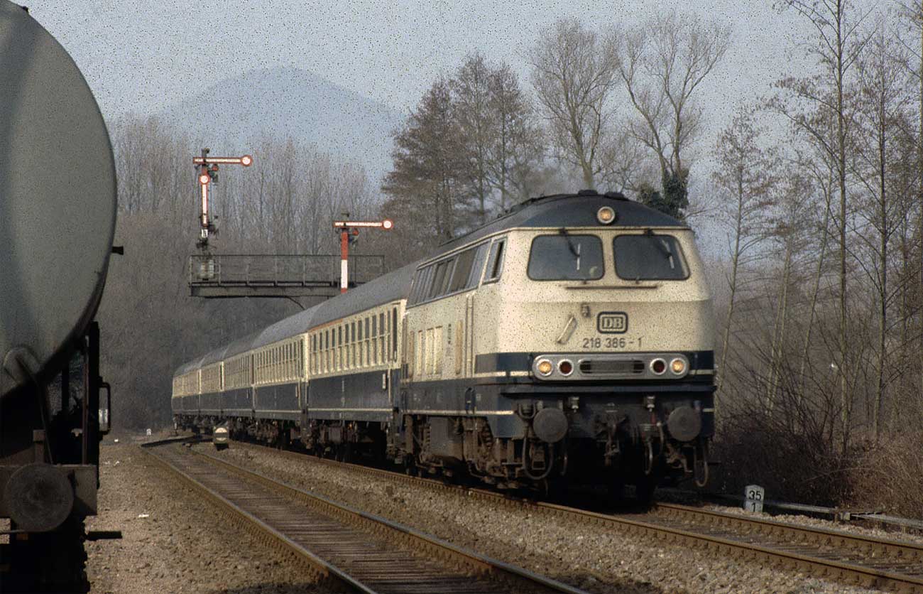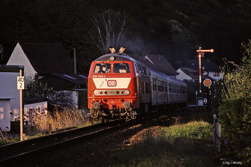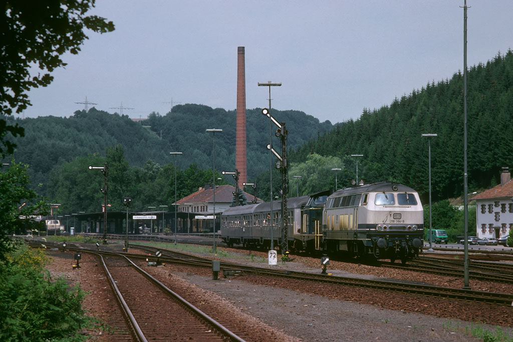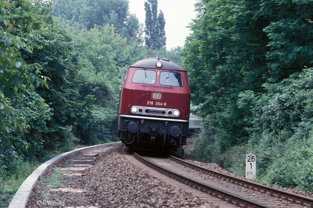 In Pirmasens Nord fährt 218 384 mit dem E 3264 (Kaiserslautern Hbf 13.42 - Pirmasens Hbf 14.28) aus.