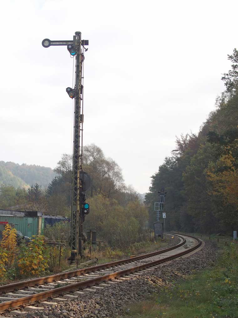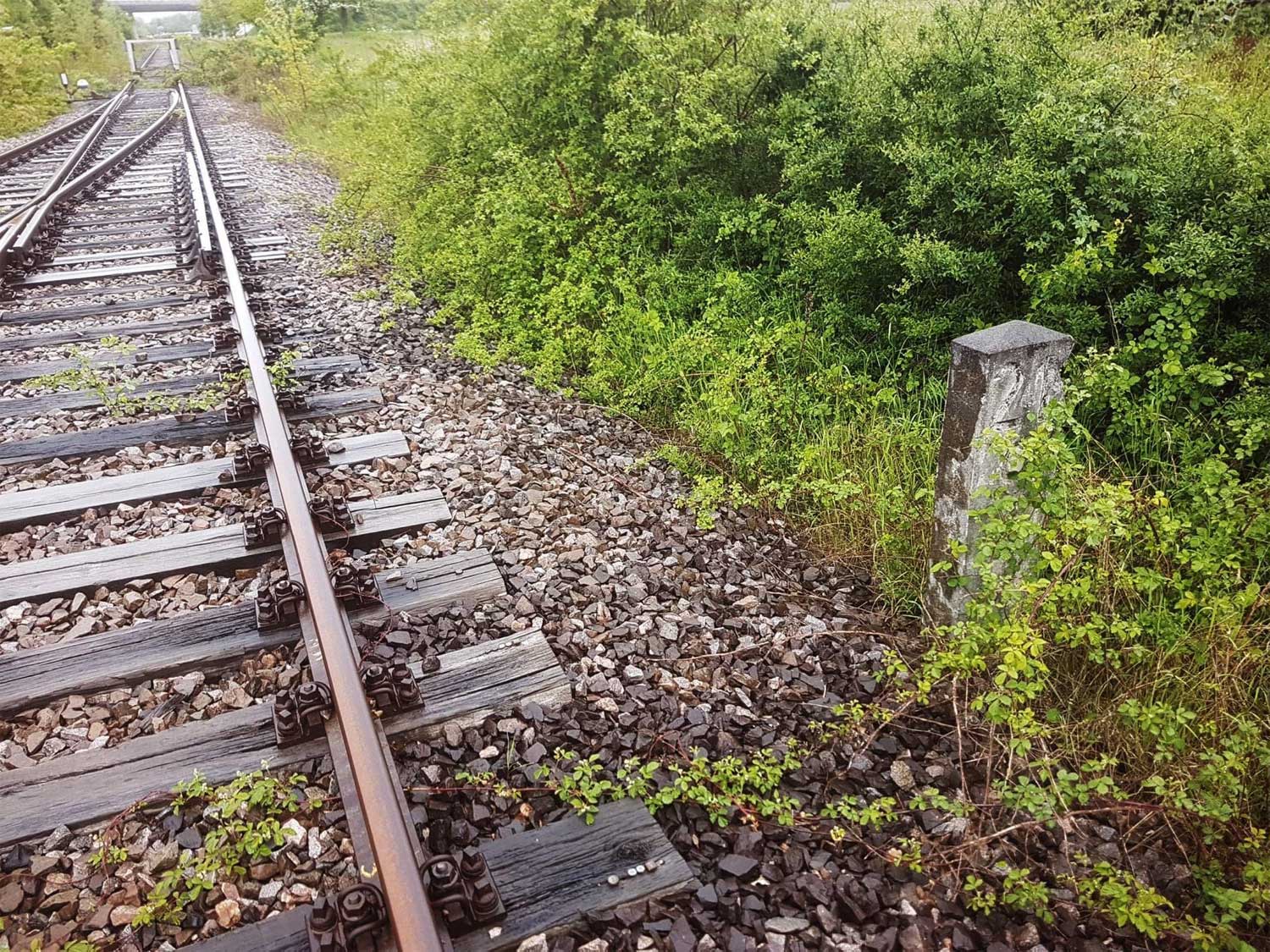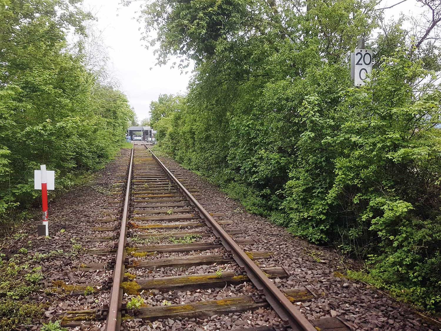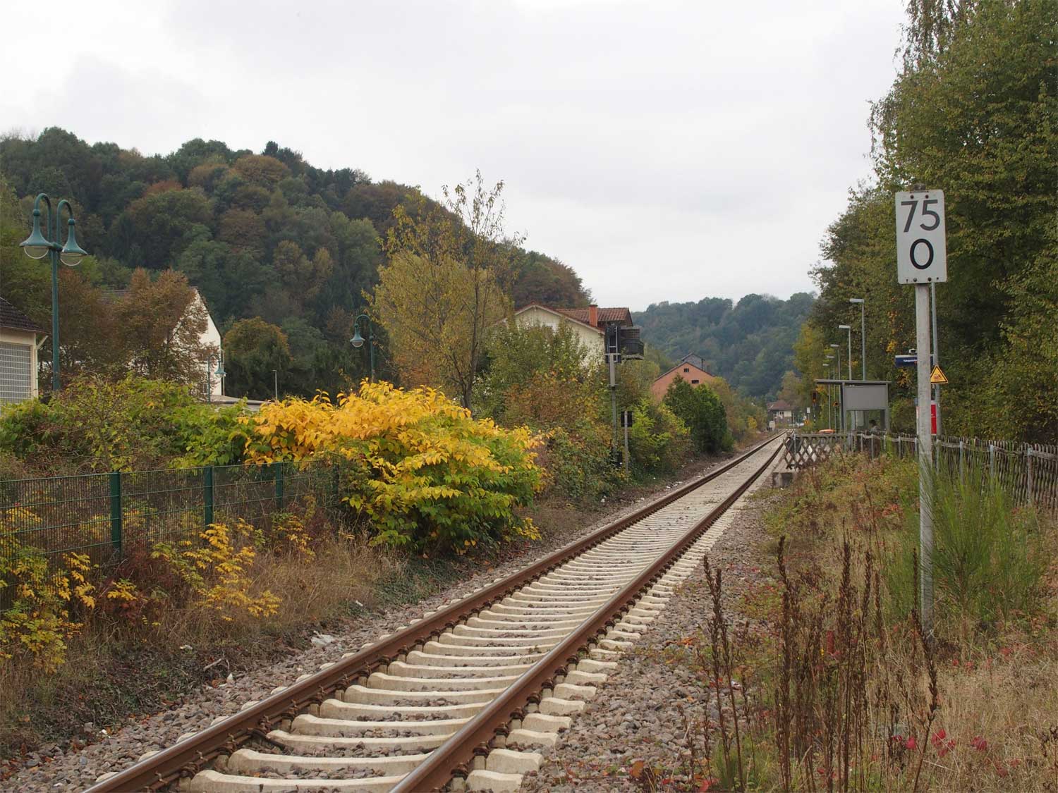 Das rechte Gleis gehört zur Strecke Homburg (Saar) Hbf 0,0 - Bierbach 9,11 - Reinheim (Saar) 26,50 - Grenze Deutschland/Frankreich 27,315 - Sarreguemines (Saargemünd) 39,0