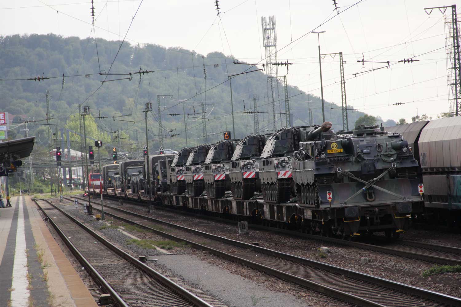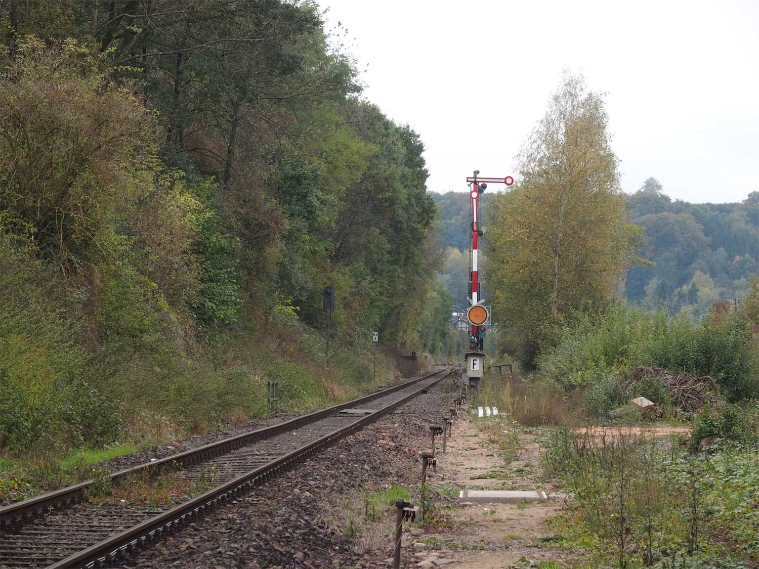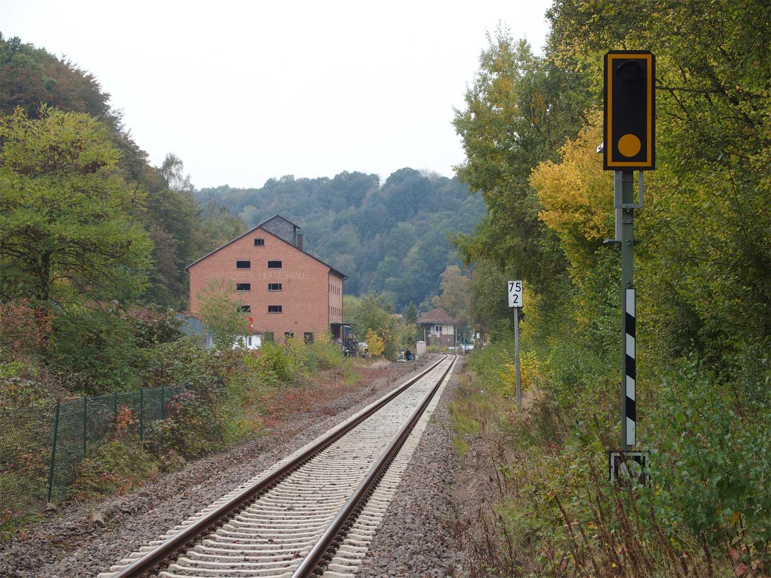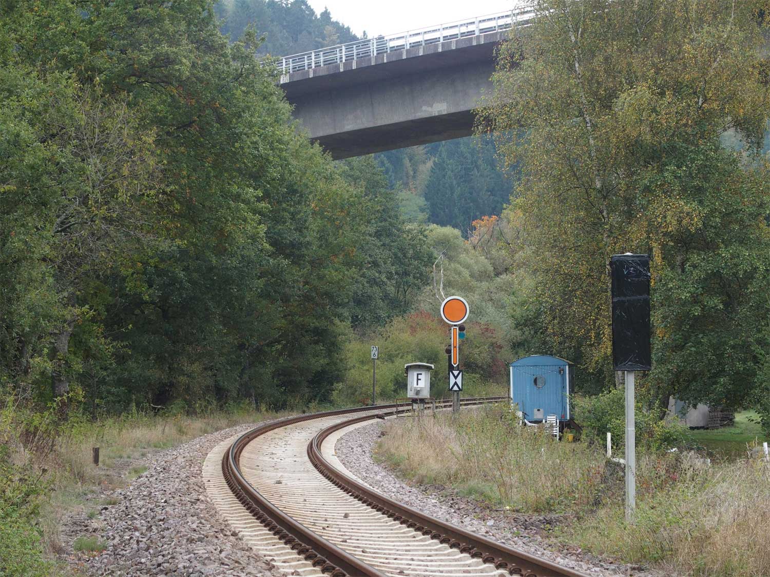 Das rechte Gleis gehört zur Strecke Homburg (Saar) Hbf 0,0 - Bierbach 9,11 - Reinheim (Saar) 26,50 - Grenze Deutschland/Frankreich 27,315 - Sarreguemines (Saargemünd) 39,0
