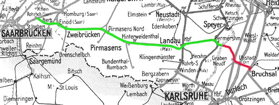 Bruchsal - Graben-Neudorf - km 22,048 = km 0,0 - Germersheim - Landau (Pfalz) Hbf - Pirmasens Nord - Rohrbach (Saar) |