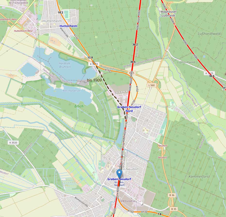 Graben-Neudorf | 9,41 | km 39,74 der Strecke Mannheim Hbf 0,0 - Schwetzingen 13,56 - Graben-Neudorf 39,61 - Karlsruhe Hbf 60,66 - Durmersheim 74,14 - Rastatt 82,93 - Wintersdorf (Baden) 90,15 - Staatsgrenze 92,014 [Rheinbrücke nach Roeschwoog 21,819 - Hagenau (Els) 0,0] |
