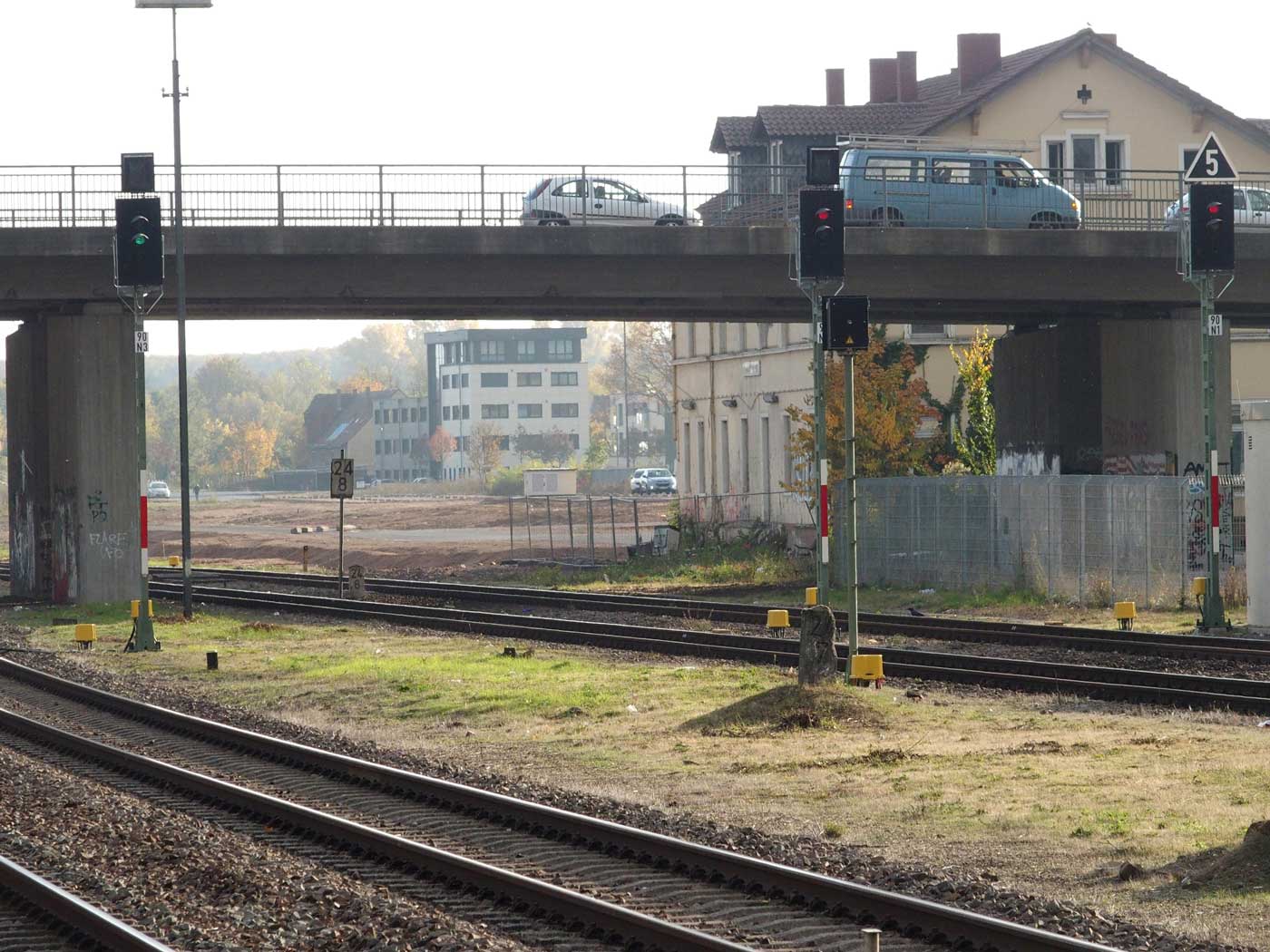 km 71,8 (im Hintergrund) und km 72,0 in Pirmasens Nord mit Stellwerk Pss - Blick Richtung Germersheim