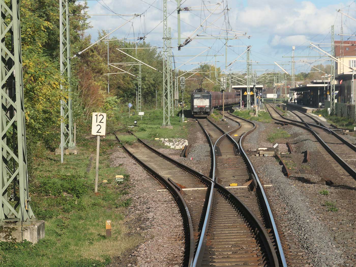 | km 49,09 der Strecke [Neunkirchen (Saar) 13,64 - Landesgrenze Preußen/Bayern - Homburg km 0,0 = km 8,37 - Ludwigshafen (Rh) Hbf 106,535 (kommend)/105,613 (gehend)] - Landesgrenze Pfalz/Hessen km 125,10 = km 0,0 - Worms 3,21 - Mainz Hbf 49,09 | ||